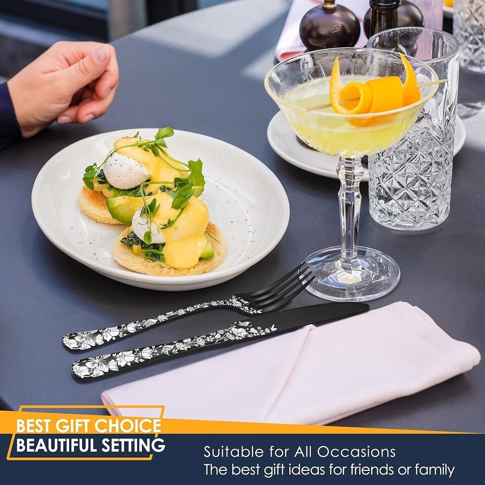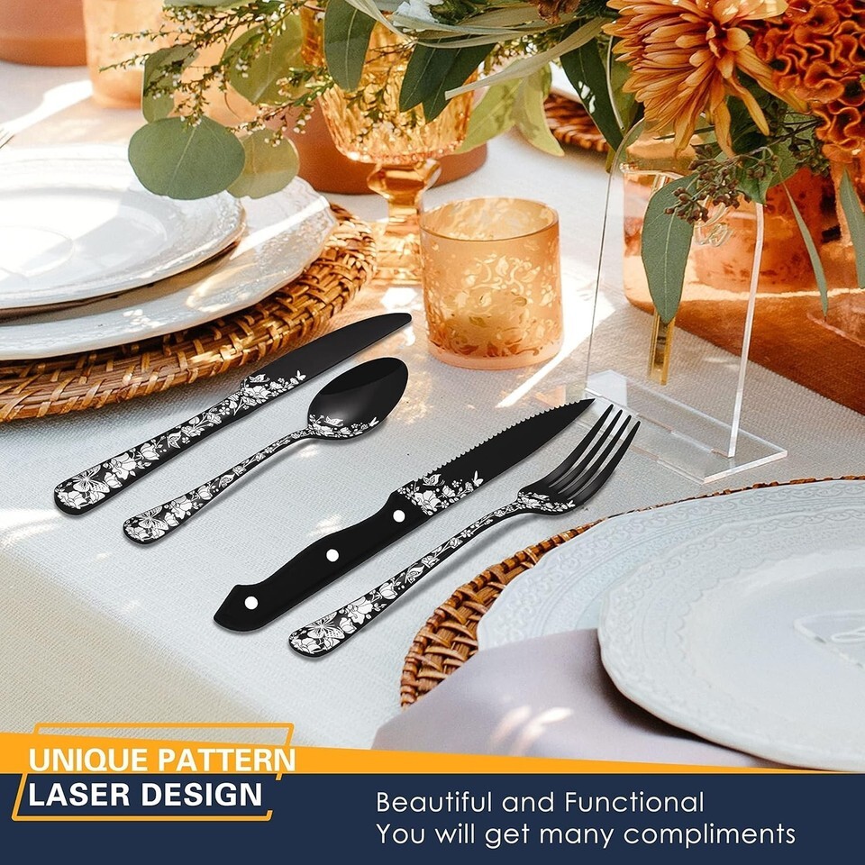 Unique Laser Design - Mirror polished black silverware set with beautiful laser prints of butterflies and flowers, unique and elegant appearance can match well with your tableware and provide a special dining experience. And its excellent shape leaves a good impression, making it a great gift idea for your friends or your family members, and you will get many compliments.