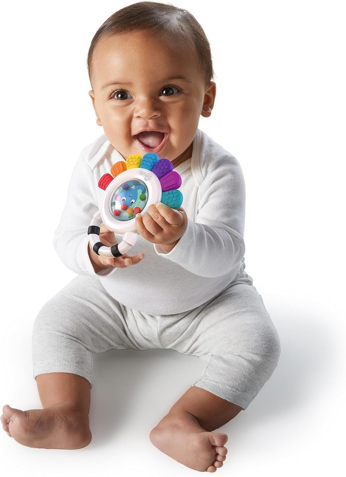 Multi-sensory teether ? Promotes sight, sound, and touch engagement with brightly colored rattle beds, and 8 touchable and teethable textures