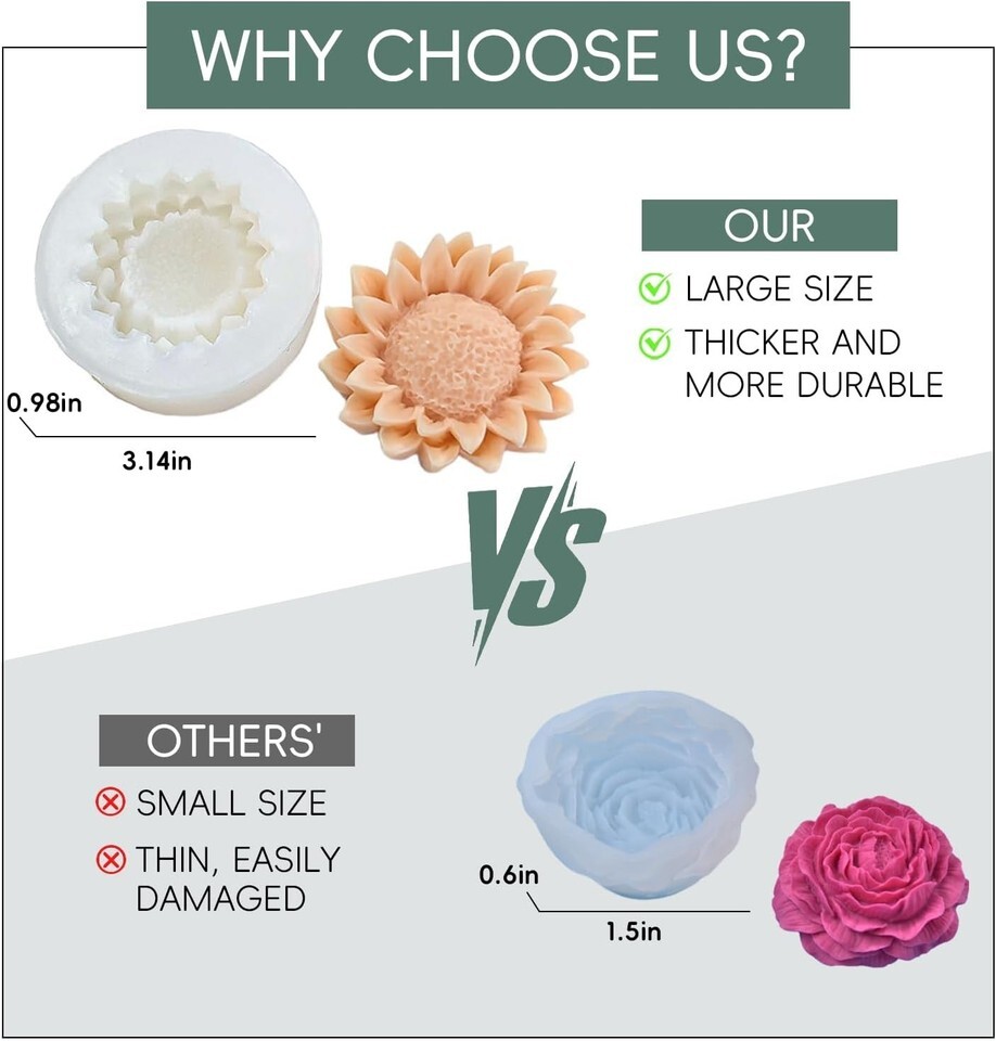Easy to Use and Demold: When making flower molds, you can mix soy wax with beeswax for a more solid finished product. The silicone material makes it easier to demold candles, and applying a small amount of oil inside the mold will make the pouring and demolding of the wax even smoother.