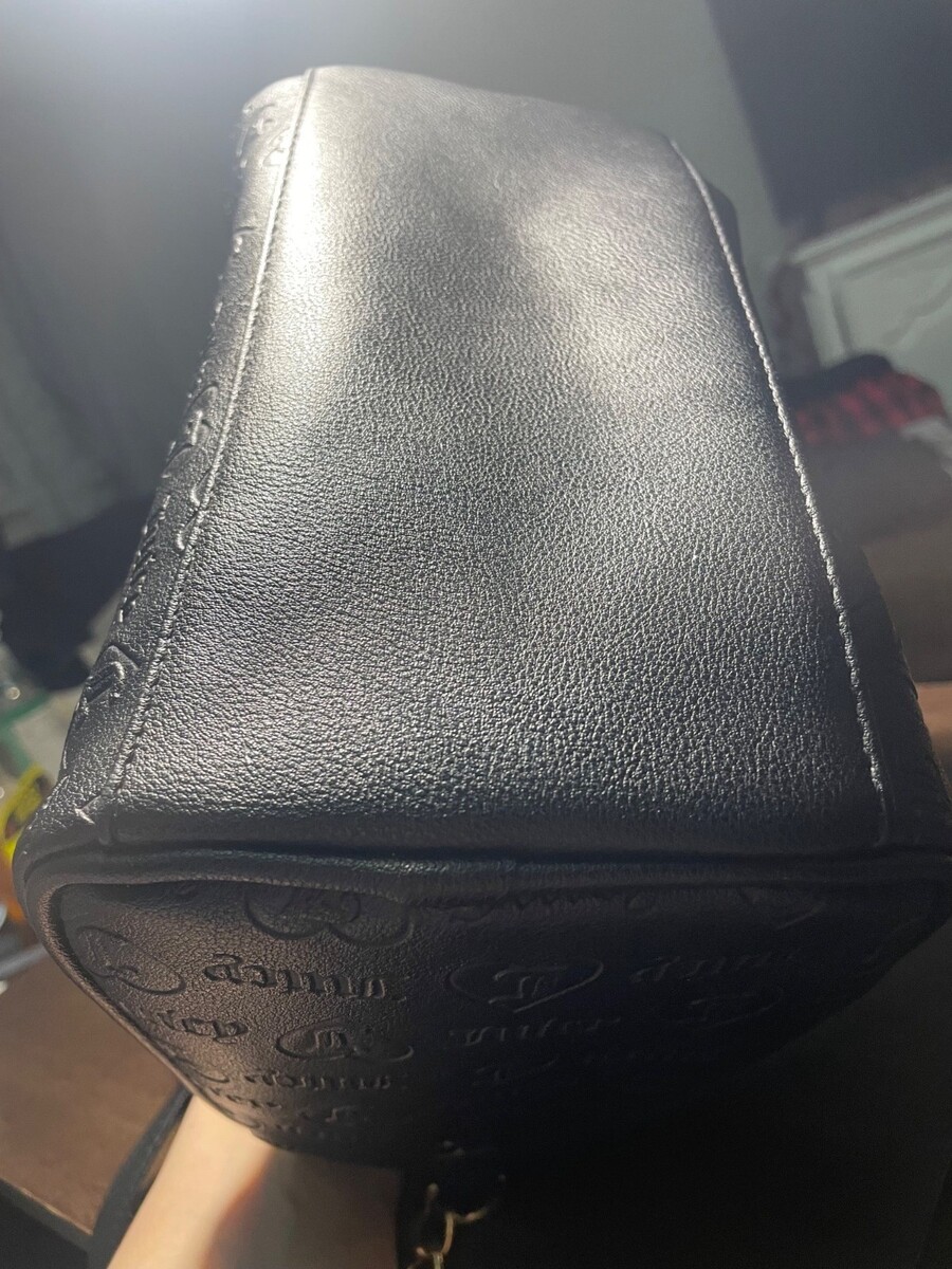 Step back into iconic Juicy Couture style with this black embossed Juicy Couture satchel bowling bag, featuring the signature logo pattern, gold-tone hardware, and a removable crossbody strap for versatile wear.
