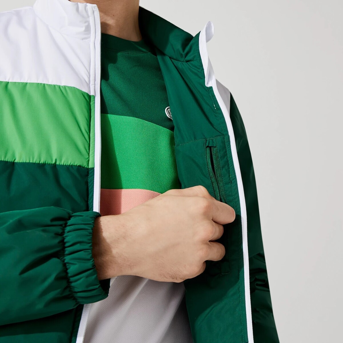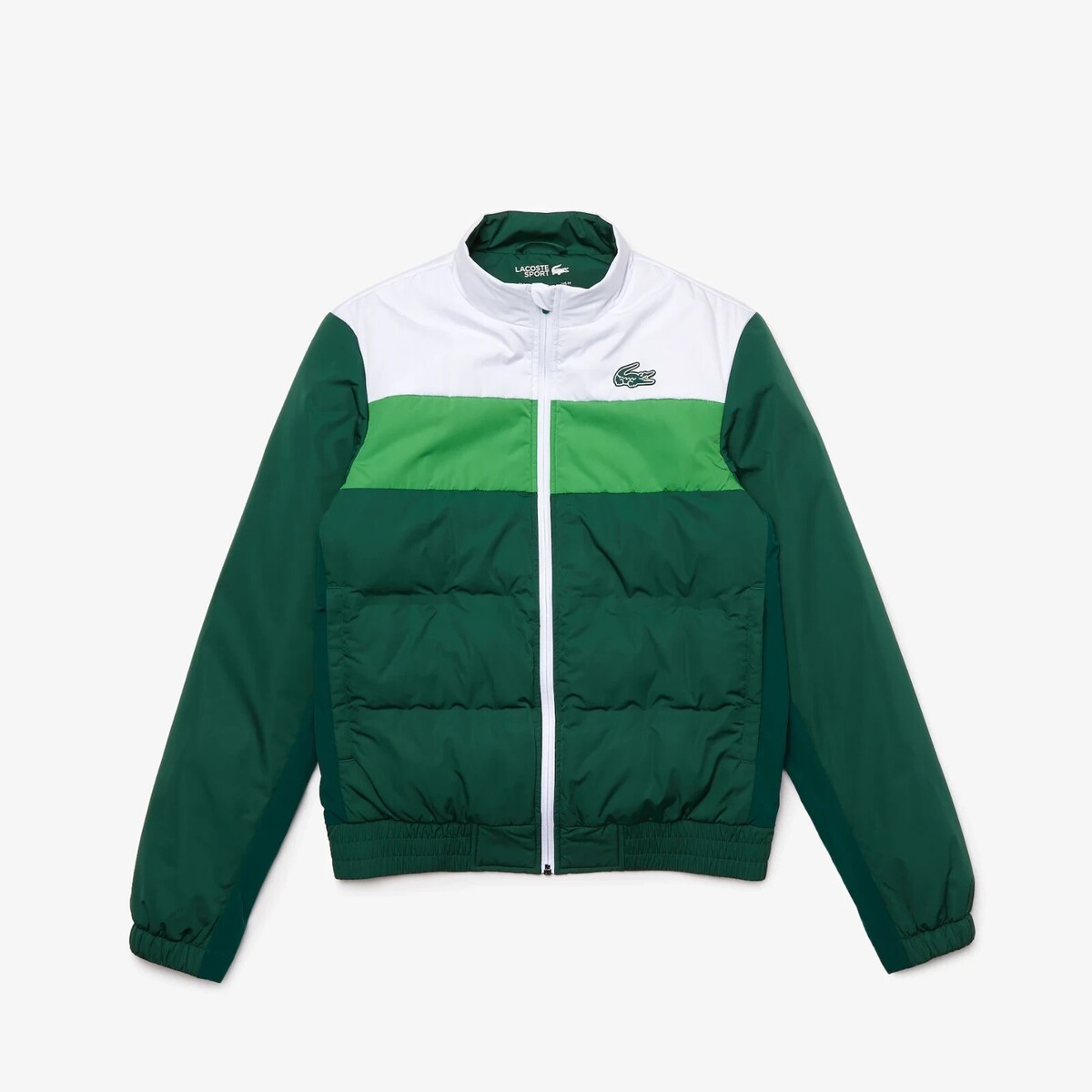Designed to keep outdoor players dry and comfortable, this quilted colorblock jacket asserts great flair. Equipped with elasticized finishes and convenient pockets, this water-resistant version is emphasized by a new two-tone silicone crocodile. Inspired by the brand?s archives, this piece has what it takes to become a new essential.