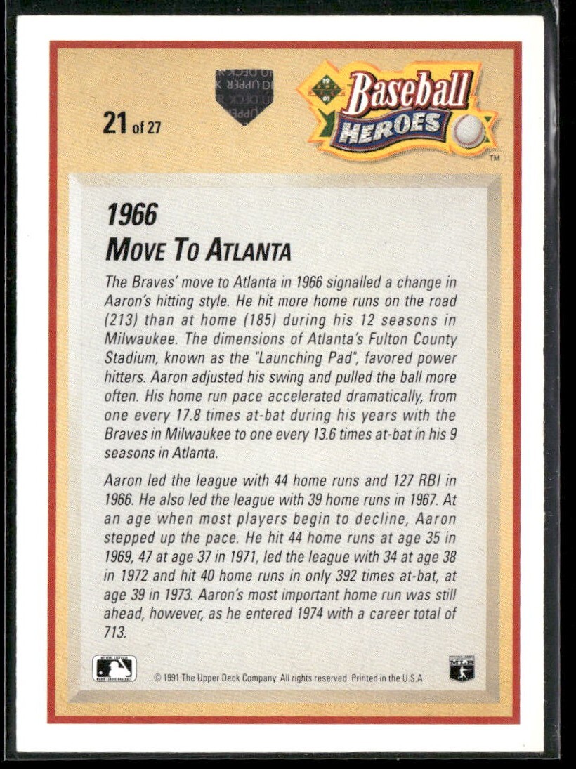 1991 Upper Deck #21 Hank Aaron Baseball Heroes: Hank Aaron