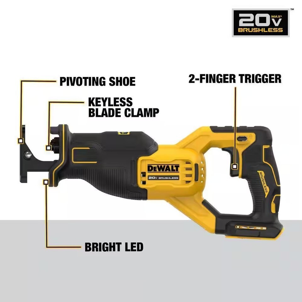 From light construction to demolition, the 20-Volt MAX. XR Brushless Cordless Reciprocating Saw delivers the cutting power and maneuverability needed by pros like you for challenging projects. This versatile Reciprocating Saw's brushless motor packs the muscle for a wide range of applications. Make quick cuts with its 1-1/8 in. stroke length and its lightweight build. Change blades easily and maintain high productivity with a variable speed trigger that offers optimized control as you work. Battery and Charger sold separately.