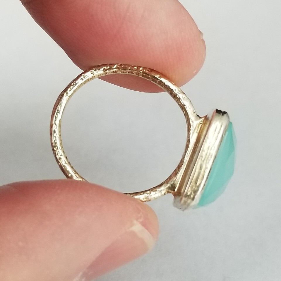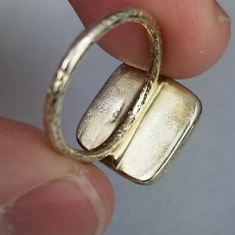 Beautiful larger square jade stone. Nice hammered setting as well.