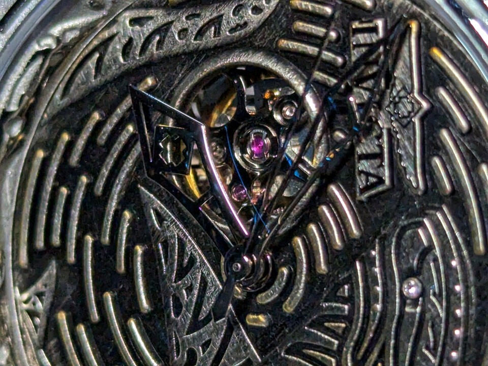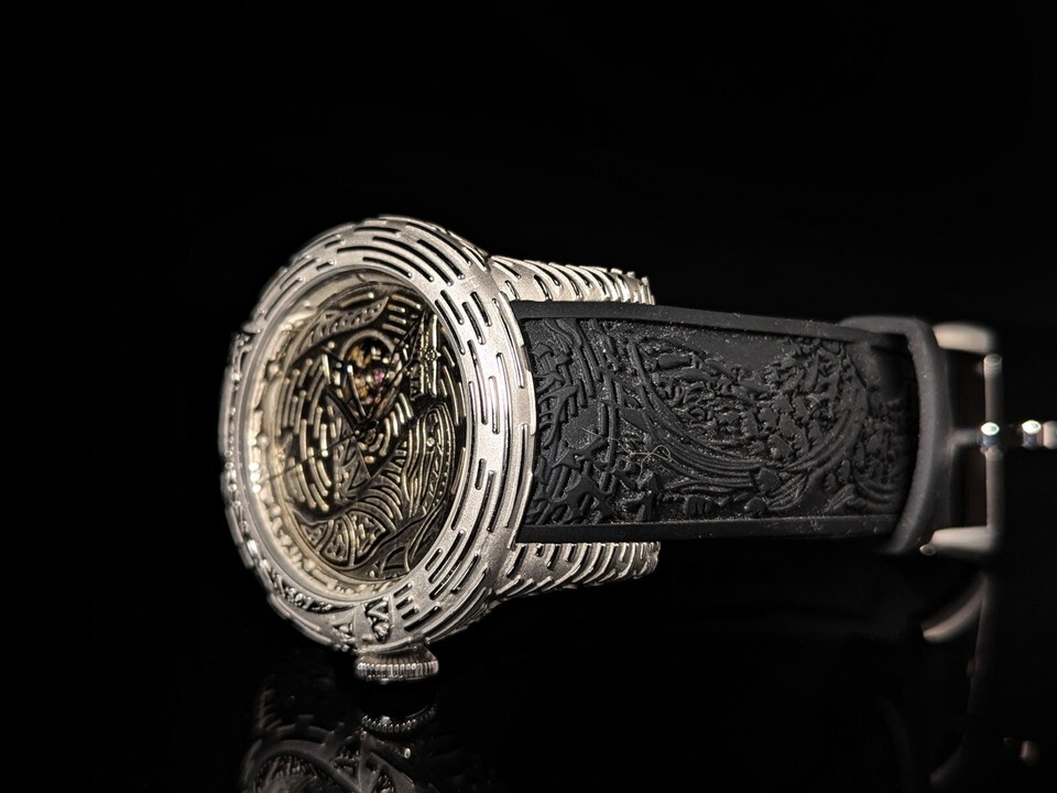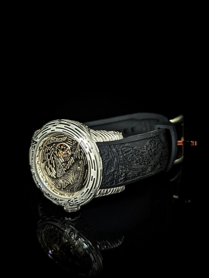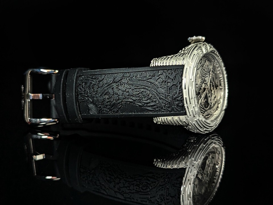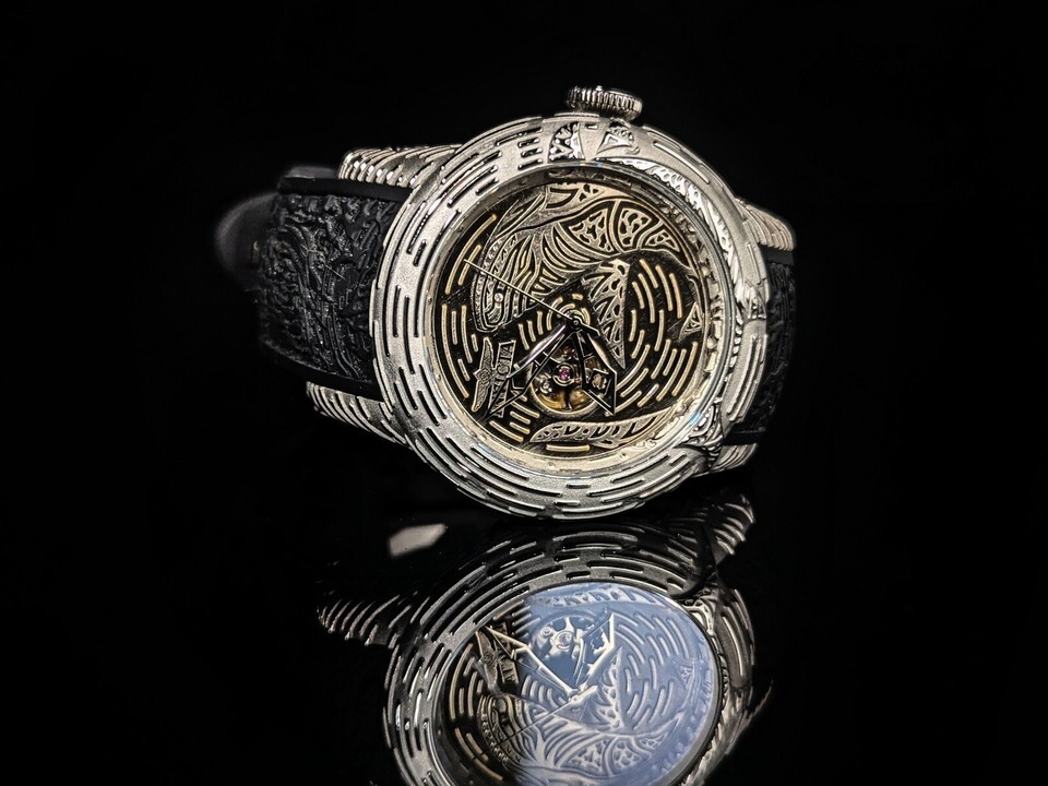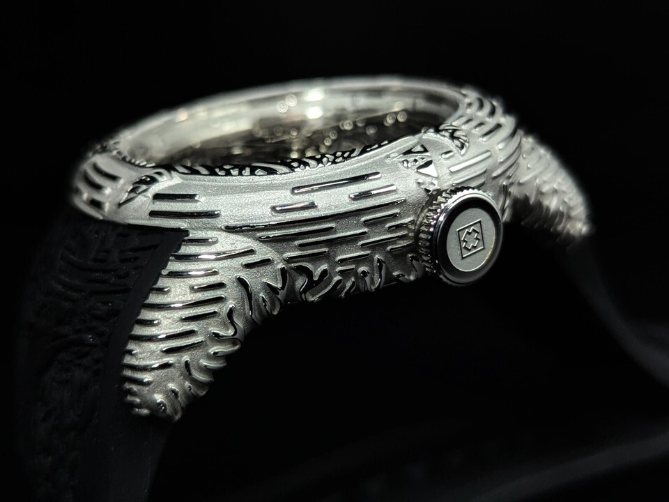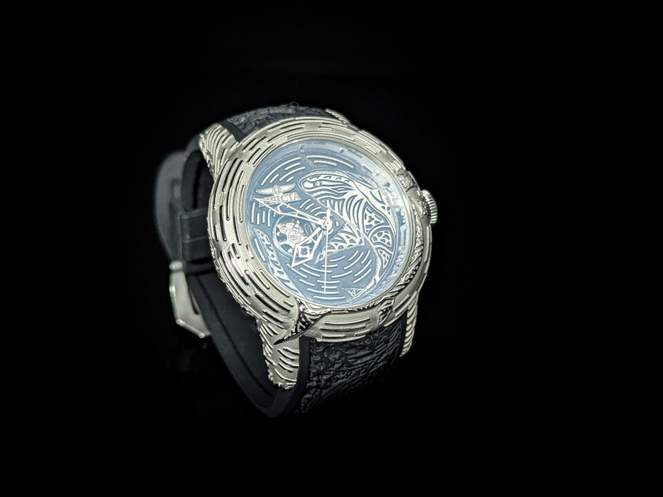 The watch has a mechanical automatic movement and a black dial with a shark pattern. It is a vintage piece manufactured in 2020 or later. The watch comes with a manual/booklet and papers, but it does not come with service records or an original box/packaging. This wristwatch is handmade and has a unique design that will make it stand out in any collection.