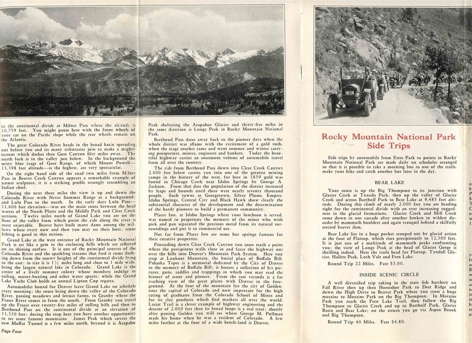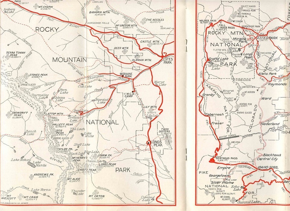 A very well illustrated 12 panel fold out brochure with lots of photos, tour information, schedules, Area Map and More. Rocky Mountain National Park Estes Park Brochure by the Rocky Mountain Parks Transportation Company of Denver Colorado.. Circa 1930's