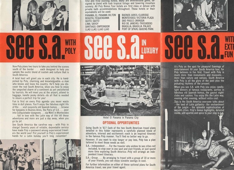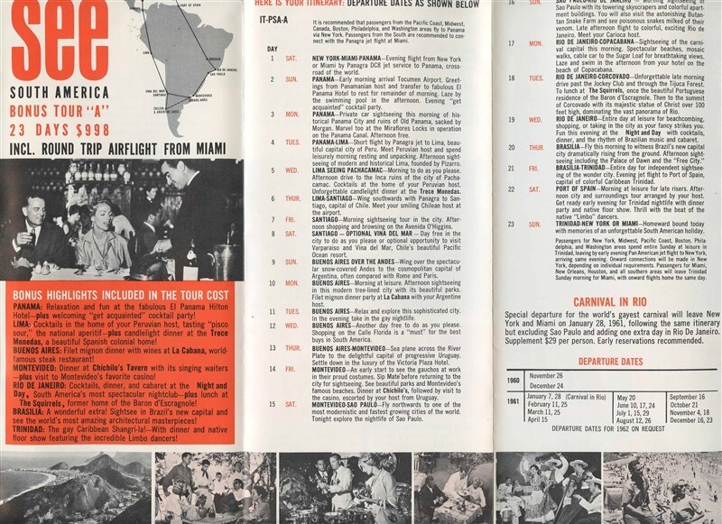 A well illustrated 16 panel fold out brochure. Pan American Panagra See South America in 1961 Brochure. Has lots of Black and White pictures, tour information with detailed itineraries, Schedules, sample fares and more. With Pam Am and Panagra DC-8 and Boeing 707 photos and information.