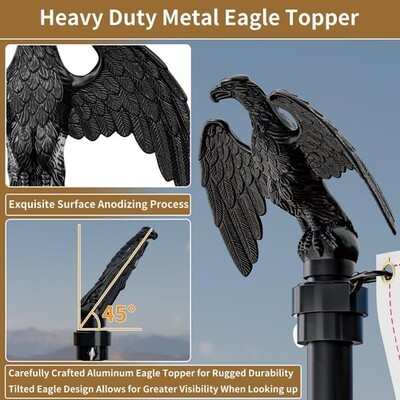 The kit features a heavy-duty weighted base that can be filled with water or sand for added stability, along with a classic eagle finial and an adjustable multi-section pole. The included 3x5 ft American flag installs easily using the included tangle-free rings.