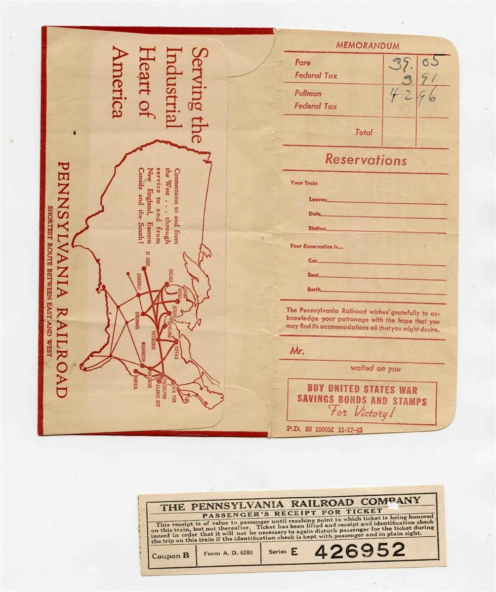 A used Pennsylvania Railroad Ticket Jacket . The Ticket Jacket has writing on inside and on cover, Contains a Passenger's Receipt for Ticket. Has route Map , Fares and War Time Travel Hints. Circa early 1940's Measures about 3 1/2" x 6 1/4" when closed.