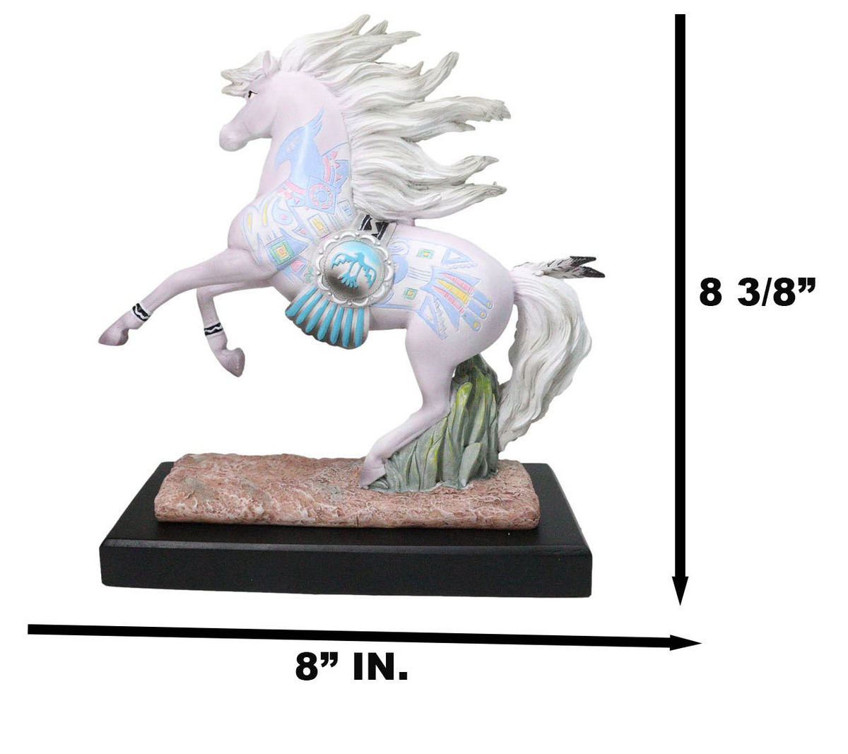 ? This Laurie Prindle Western Horse Figurine measures 8.25" tall, 8" wide and 3.25" deep approximately. It weighs about 2 pounds.