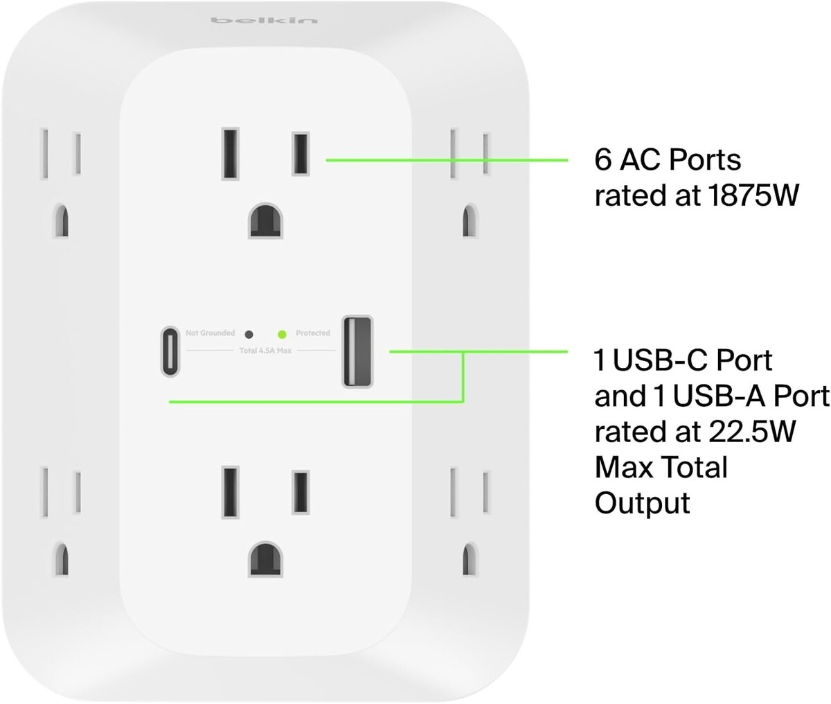 ETL CERTIFIED: Part of our 14-point safety system, this 6-outlet wall surge protector has been independently lab tested and certified to meet or exceed ETL safety standards.