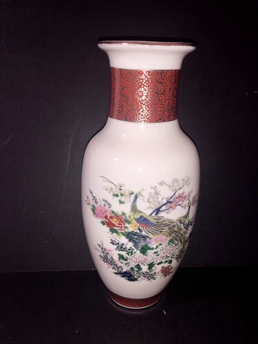 Satsuma Japan Vintage Peacock Floral Vase 12 inch 1979 Red Gold Rim Floral