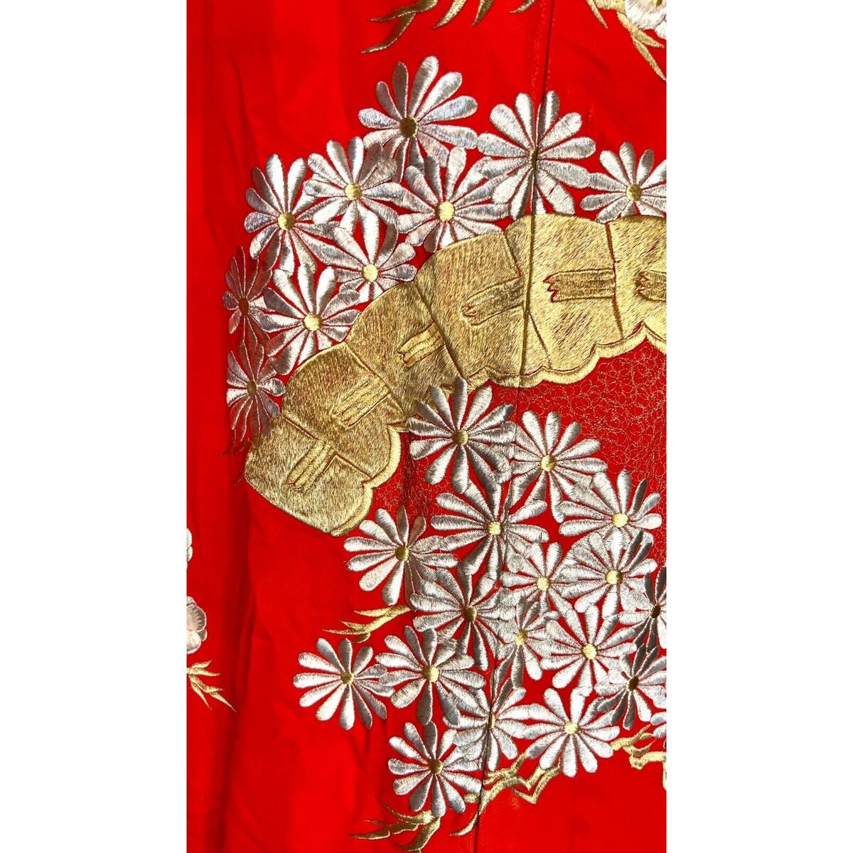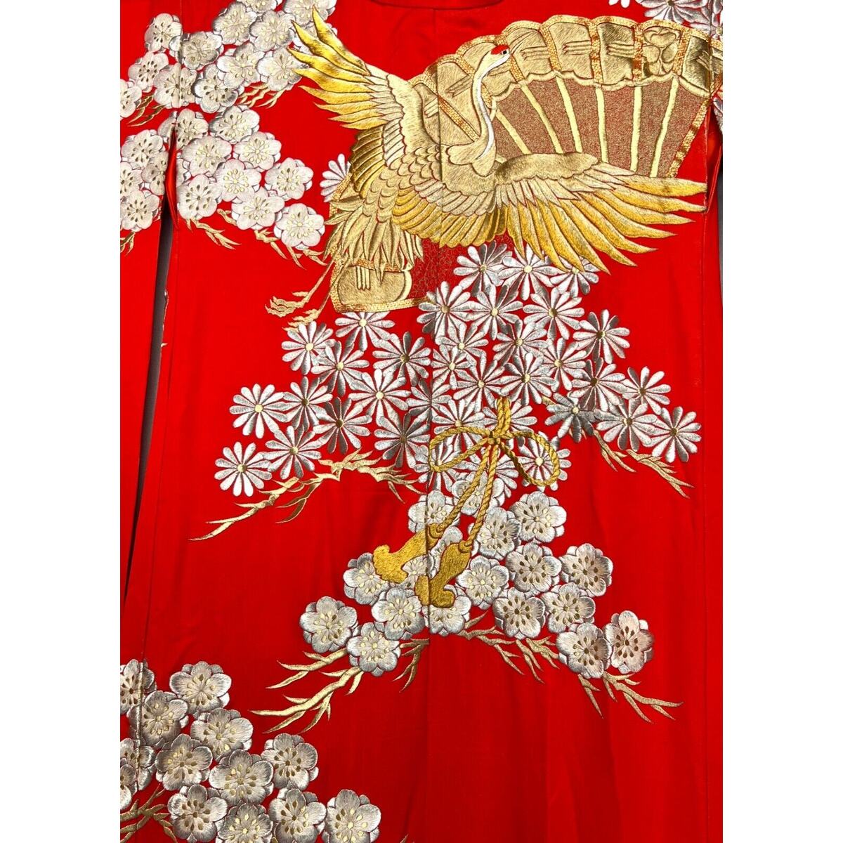 The surface decoration displays a high level of technical precision consistent with professional workshop production. The embroidery appears to be machine-assisted, a common and historically appropriate practice for formal wedding garments of the mid-20th century, particularly those produced for ceremonial or display use. This does not diminish the artistic or cultural value of the piece; rather, it reflects the evolution of Japanese textile production during the Showa period, when advanced embroidery techniques allowed for exceptional consistency and durability in luxury garments.