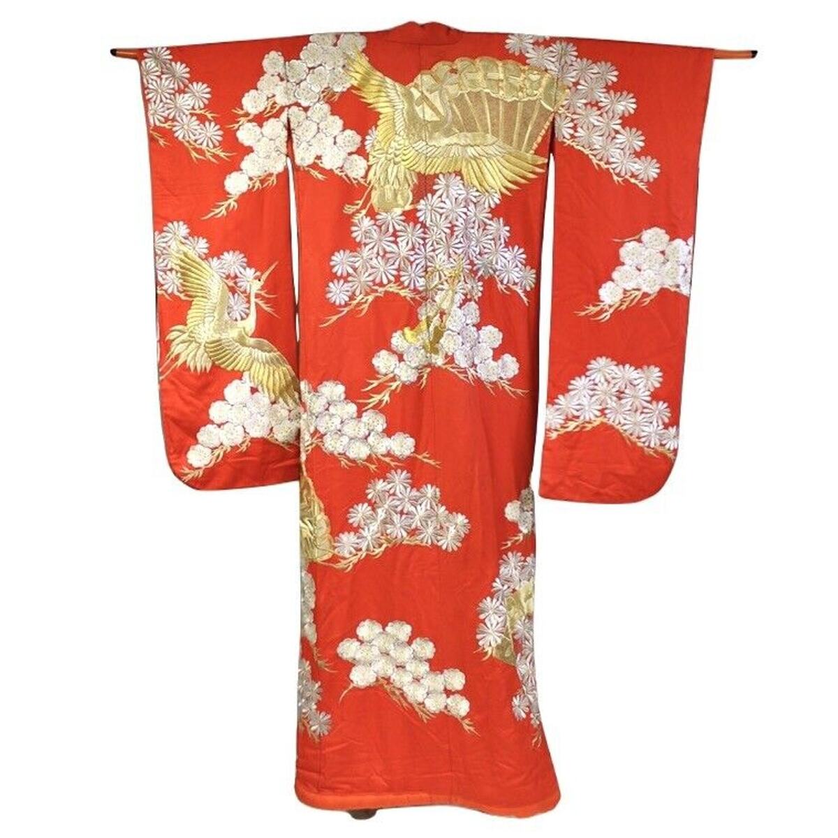 This vintage Japanese uchikake is a formal wedding kimono executed in richly colored red silk and decorated with auspicious imagery of cranes and flowering botanicals rendered in gold and silver embroidery. Traditionally worn unbelted over the bridal kimono ensemble, the uchikake is designed to trail behind the wearer, creating a ceremonial silhouette associated with longevity, fidelity, and prosperity.