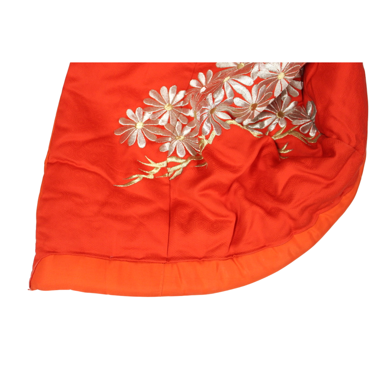 Cranes?longstanding symbols of marital harmony and long life?are prominently featured alongside stylized floral clusters, arranged in a balanced, flowing composition across the garment. Metallic threads catch the light subtly, enhancing the visual depth without overwhelming the silk ground. The interior remains unpatterned, consistent with uchikake construction. Importantly, this kimono is numbered ?101,? marked on the garment, suggesting it was part of a controlled production, workshop series, or formal inventory system rather than an anonymous export piece. Such numbering is commonly associated with bridal ateliers, ceremonial wardrobes, or documented collections.