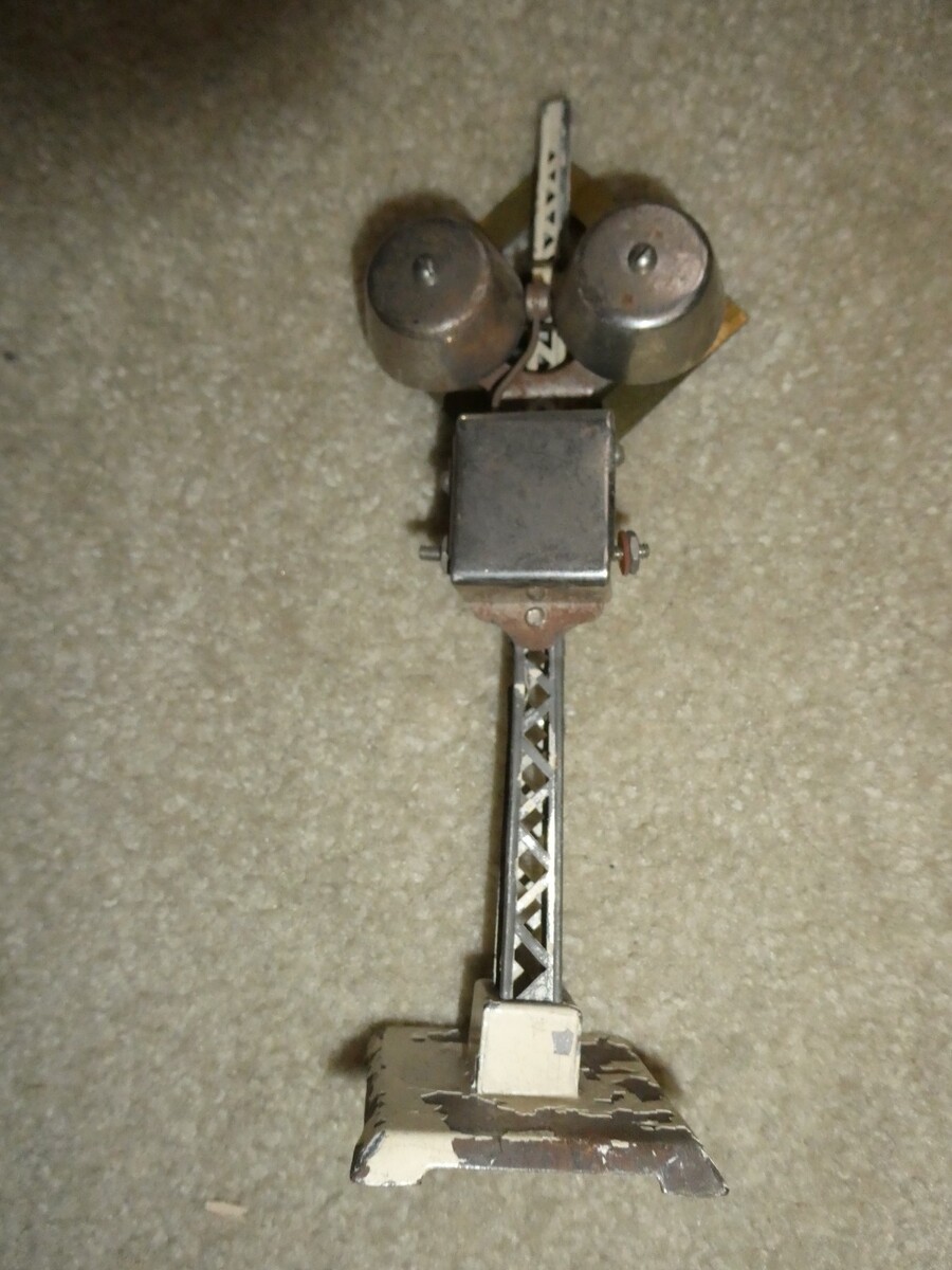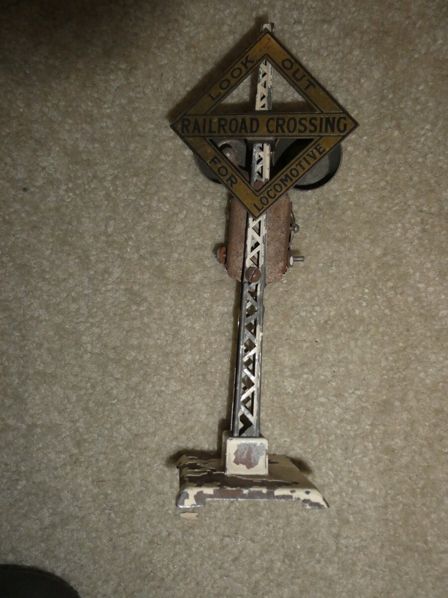 You are bidding on an older, O or maybe standard scale, unmarked, well worn, metal operating railroad crossing signal for parts or repair in the pictures. 8 1/2 inches tall. Well worn with rusting, paint loss, unknown working condition, could use a cleaning or use as shown. Zoom in for details.