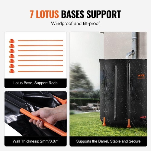 Secure and Stable: The water barrel features 7 support poles, each 0.07" thick, combined with a sturdy lotus base, ensuring its stability in any situation. Even under heavy load, it won't tilt or collapse. It can be securely anchored to the ground, remaining intact even on windy and rainy days.