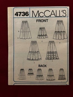 The product is a vintage McCall's sewing pattern 4736 from the 1990s. It is for a female adult or teen and is compatible with sizes 10 and 12. The pattern features a skirt design that is uncut, making it a reusable resource for sewing projects. Perfect for those interested in crafting and creating custom garments with a nostalgic touch from the past.