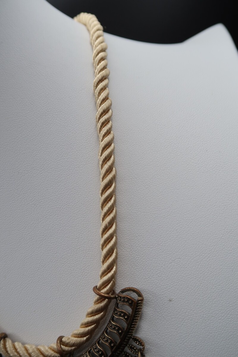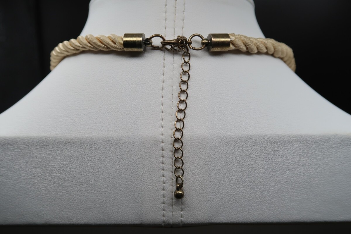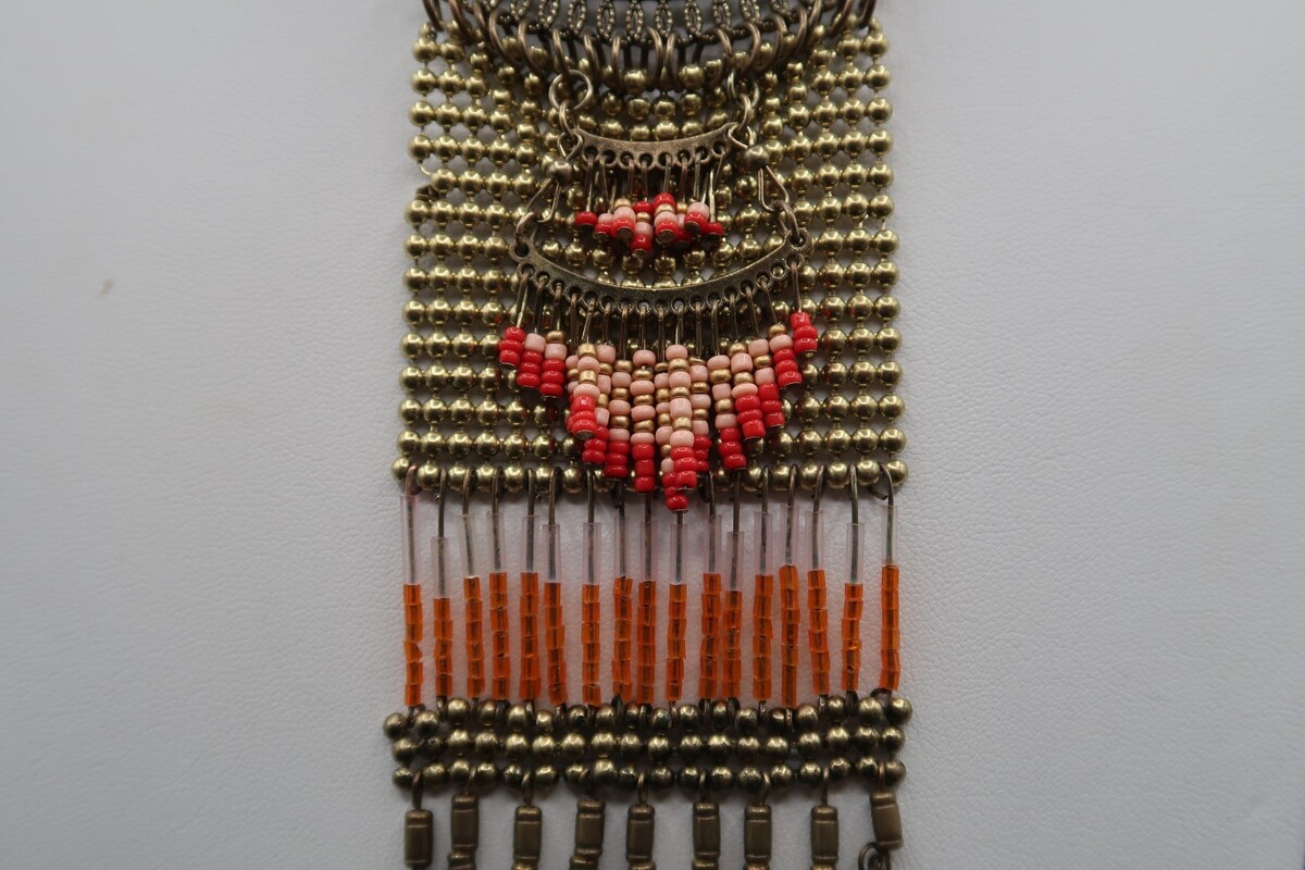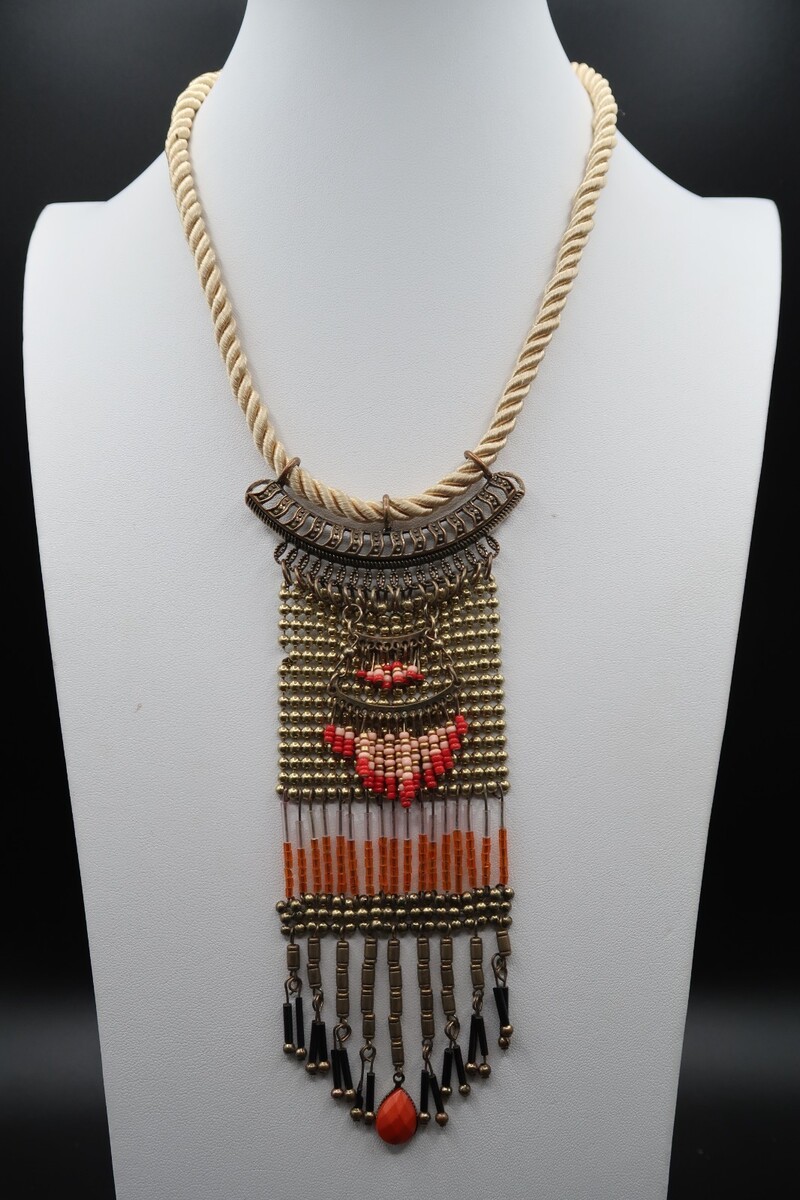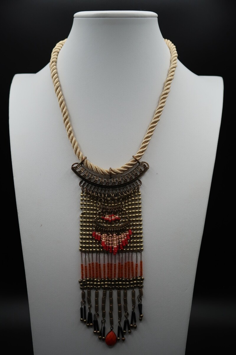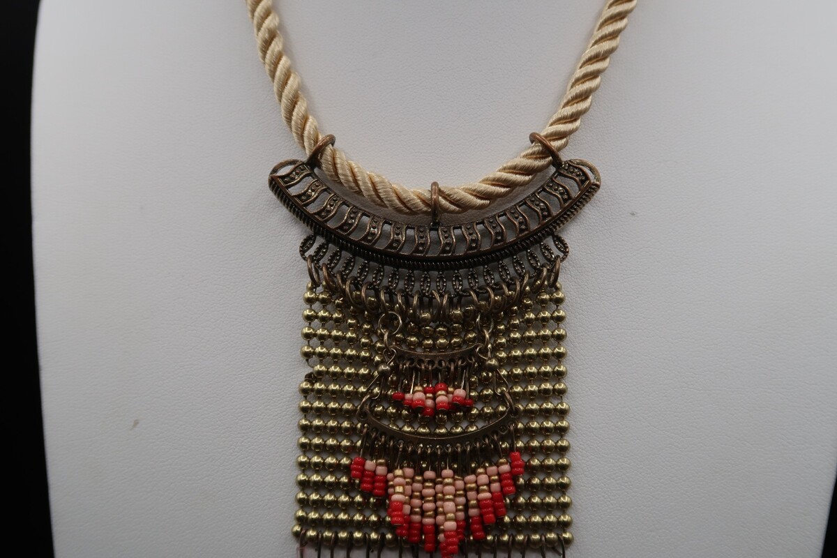 Vtg Tribal Look Statement Bib Necklace Gold Tone Beads Chain Cord Boho Beautiful