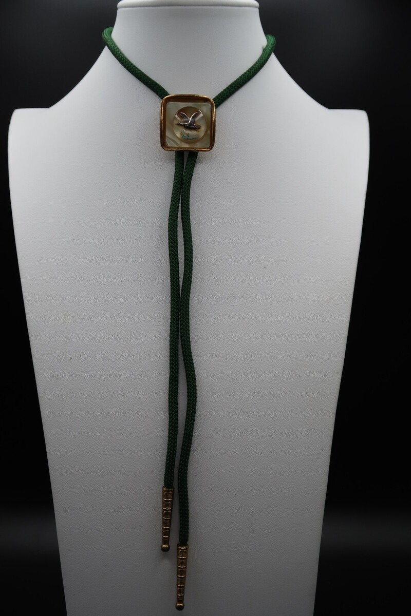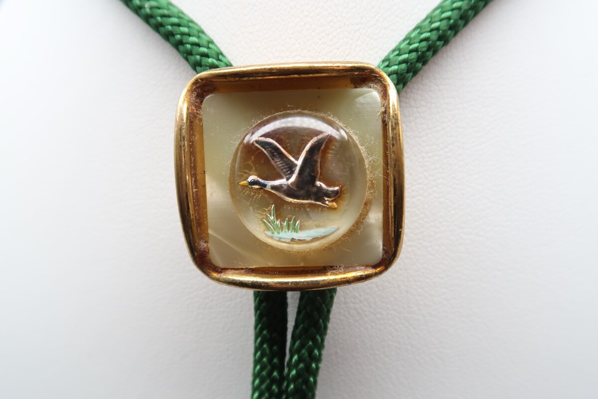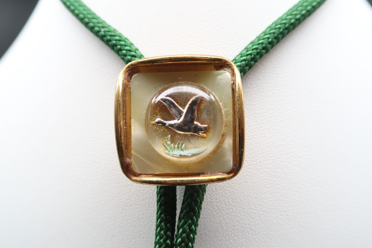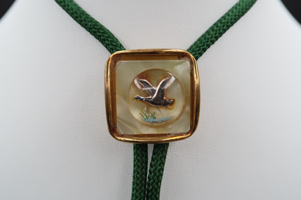 Vtg Green Cord Bolo Tie or Slide Necklace w/ square Duck Nature Scene Clasp