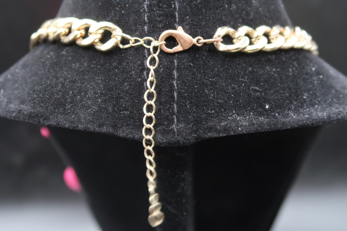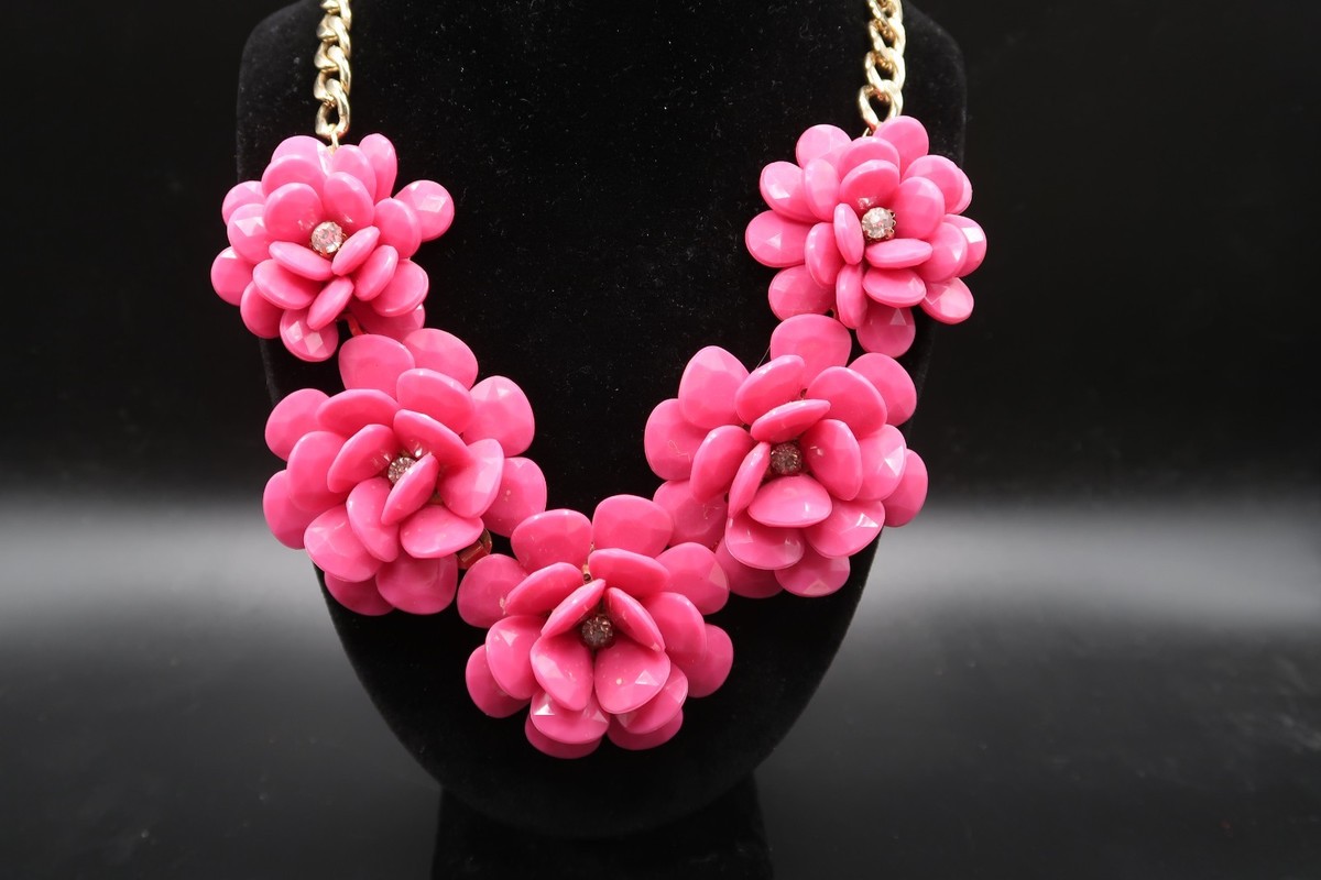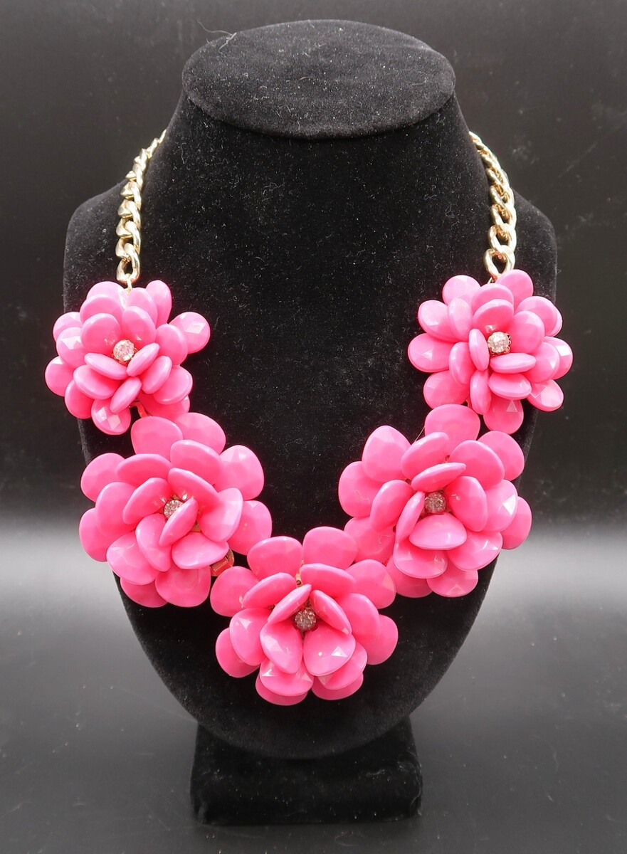 Vtg Pink Acrylic Resin Flower Statement Necklace w/ Gold Tone Chain Rhinestone