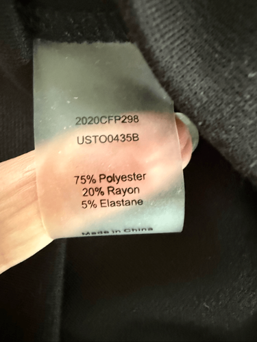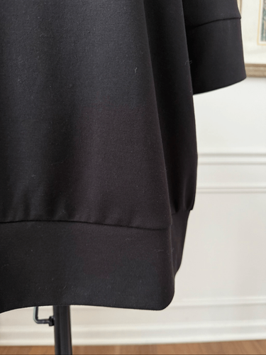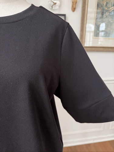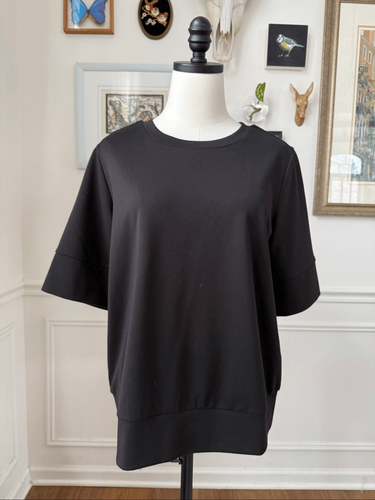 Universal Standard black short, or elbow length, sleeve round neck pullover with loosely banded cuff and waist. Midweight T-shirt material. Polyester rayon and lasting blend. Laying flat measures 25.5 inches shoulder to hem and 22.5 inches armpit to armpit.