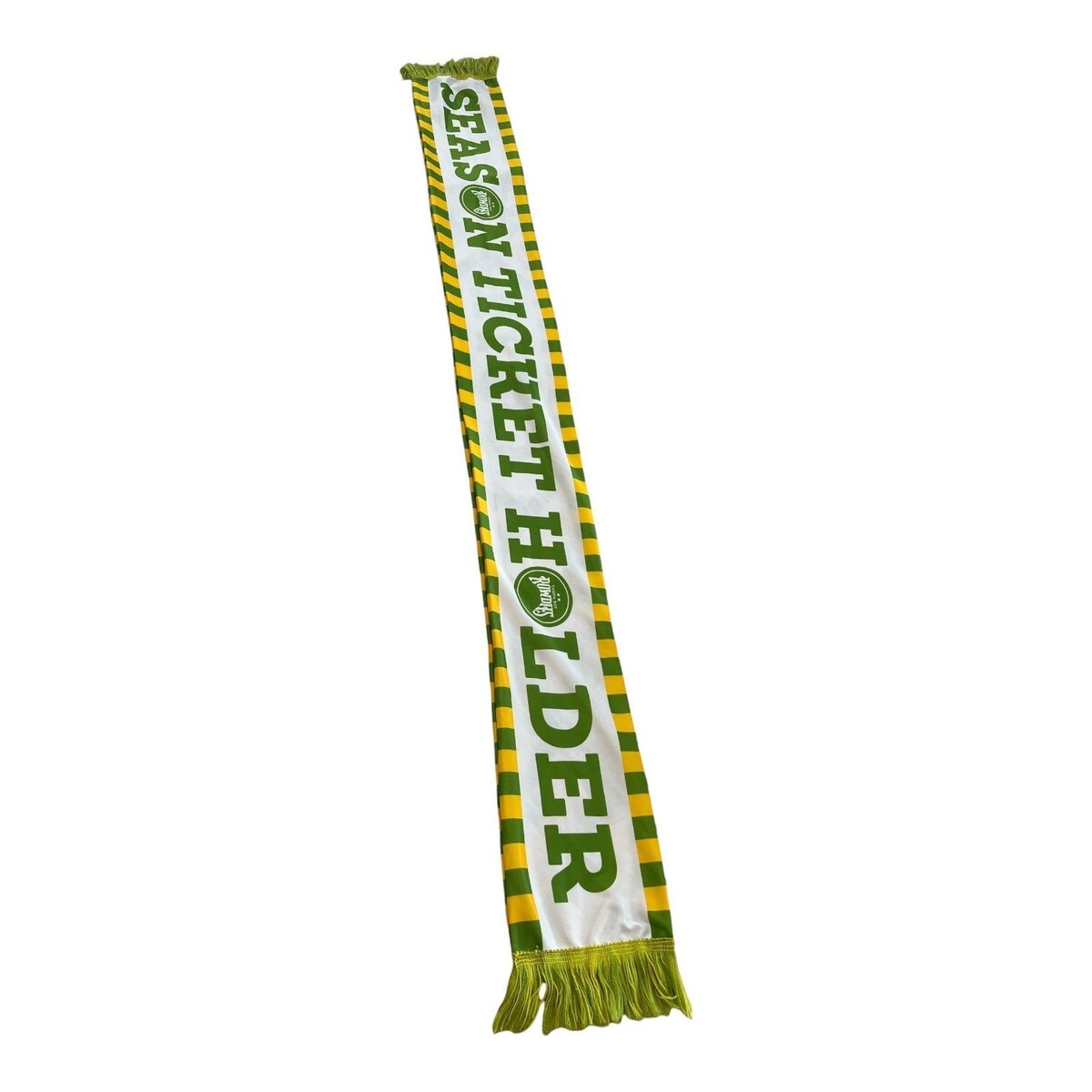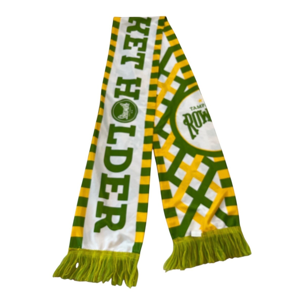 Official Tampa Bay Rowdies season ticket holder scarf featuring bold green, yellow, and white graphics with fringe ends. Made from a smooth, slick fabric with a lightweight feel rather than a knit construction. Double-sided design showcases team branding and geometric patterning. Ideal for match days, sports displays, or soccer memorabilia collections.