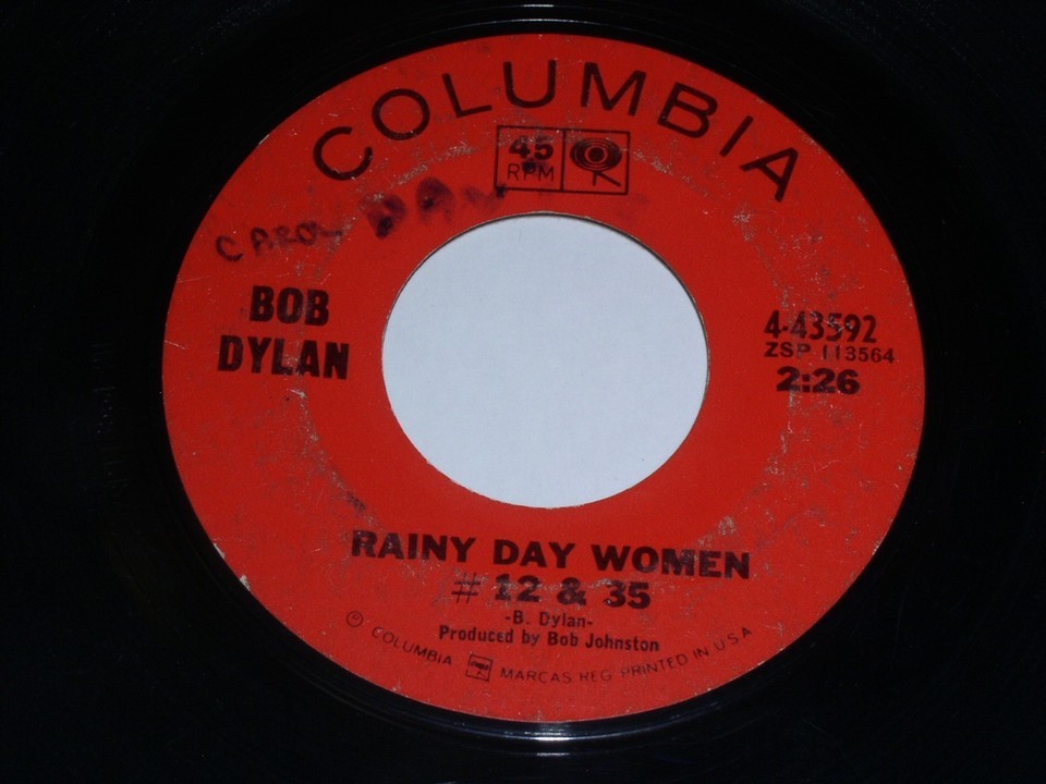 This is the original, vintage 45 rpm record by Bob Dylan entitled, "Rainy Day Women #12 35". Flipside: "Pledging My Time". Record label Columbia 4-43592.