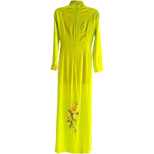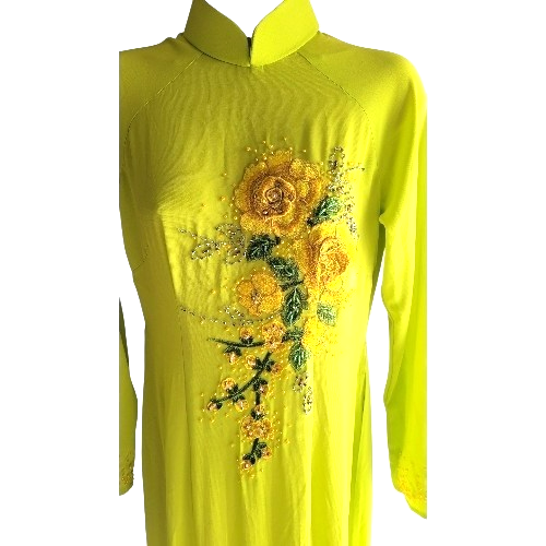 This vibrant chartreuse (yellow/green) Ao Dai is a stunning blend of traditional Vietnamese silhouette and contemporary artisanal detail. Perfect for formal celebrations or cultural events, this garment features intricate hand-crafted embellishments and a flattering, elongated fit. The bodice and lower front panel are adorned with high-quality 3D yellow-orange applique embroidered apricot flowers that provide a rich, tactile texture. The apricot blossoms symbolize spring, luck, wealth, prosperity and are traditionally used for Lunar New Year decorations in the Southern region. The floral motifs are enhanced with crystal and silver beading, adding a delicate shimmer to the garment under studio or natural lighting. Vibrant green applique embroidered leaves are woven throughout the floral pattern, creating a balanced, nature-inspired aesthetic. Subtle small round yellow beading accents the main floral designs on the bodice and provides a finished look to the sleeve cuffs. Designed for a smooth fit, the gown features a center back zipper closure supplemented with a snap button at the collar for security and comfort. The design follows a traditional botanical floral and branch motif, with one floral arrangement sweeping across the chest and a second, larger arrangement anchoring the lower portion of the gown. This listing is for the ao dai only, no pants.