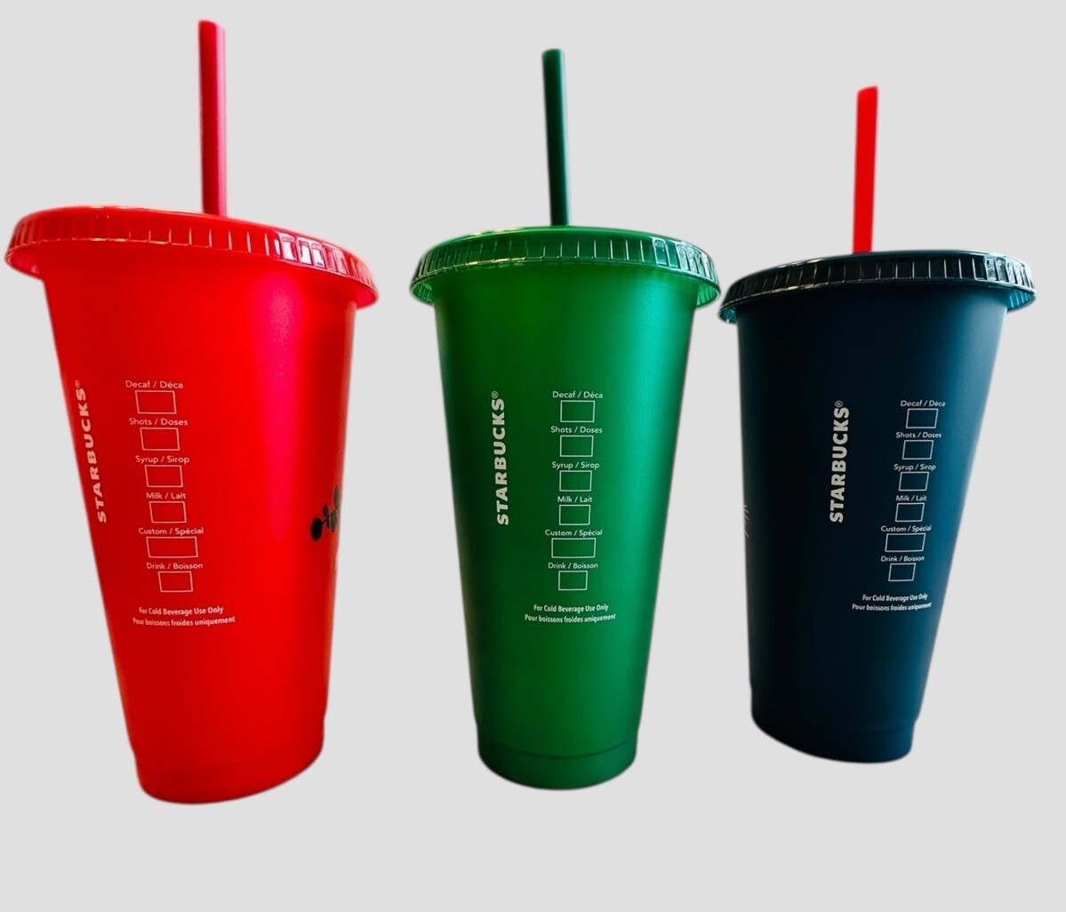 The Starbucks New 3-pack 24oz Reusable Cold Venti Cups with Lids Straws is a festive and eco-friendly set featuring the iconic red and green holiday colors. Made in the original Starbucks brand, these cups showcase a coffee and tea theme, perfect for collectors and coffee enthusiasts alike.