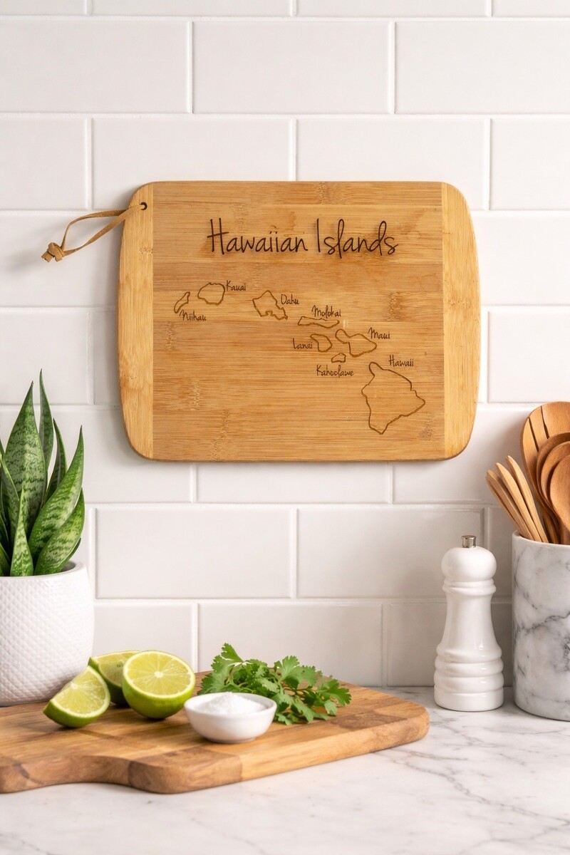 Decorative bamboo board featuring an engraved map of the Hawaiian Islands with island names labeled. Made of solid bamboo with a smooth finish, rounded corners, and a leather hanging loop. The reverse includes wall-mount hardware, making it suitable for display as wall decor as well as light decorative use. A great coastal or island-themed accent for a kitchen, bar, or vacation home.