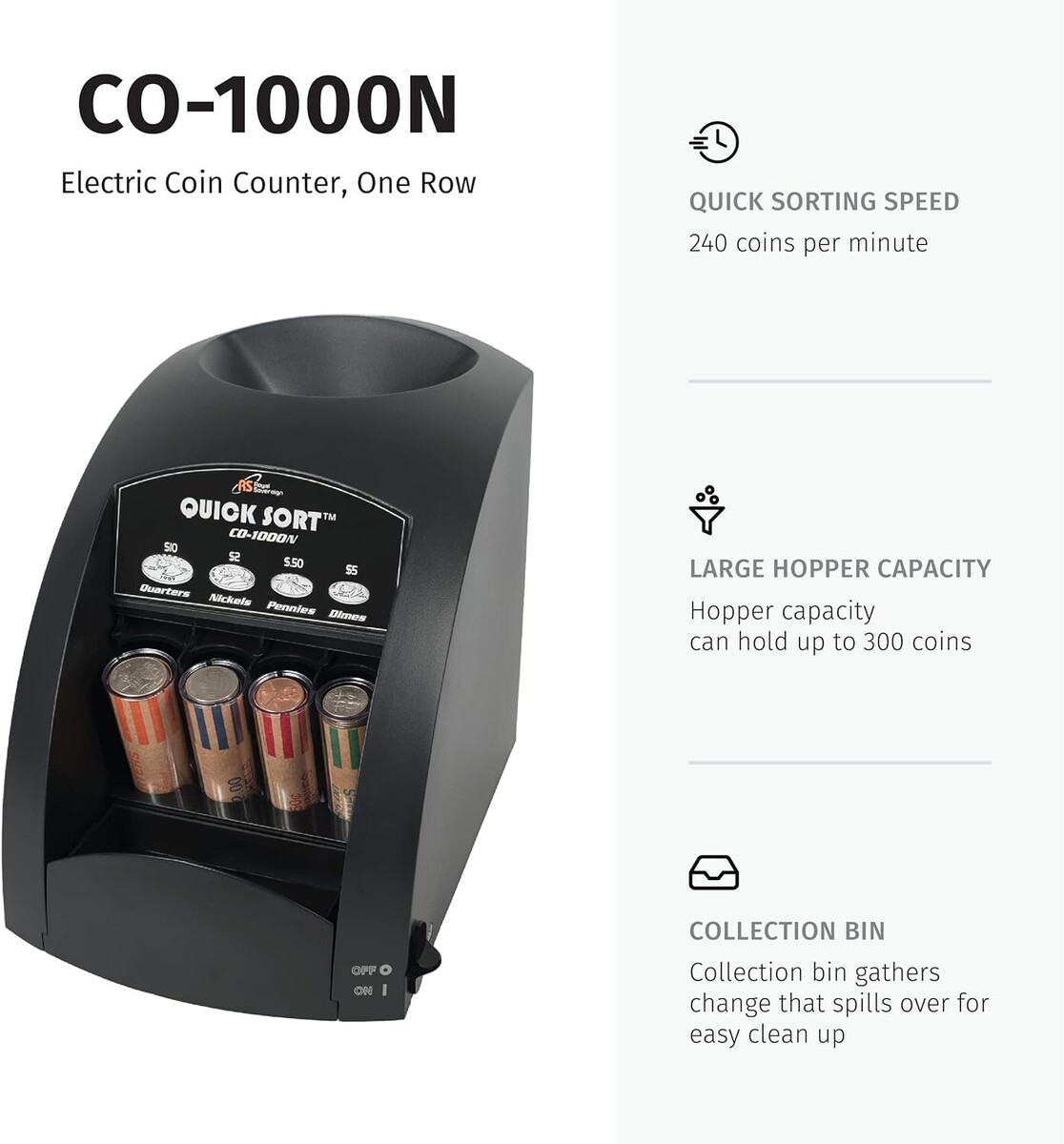 The 1 Row Electric Coin Sorter is the perfect solution for fast, convenient, and simple automatic coin sorting. The CO-1000 sorts 240 coins per minute and can hold up to 300 coins at a time. Anti-jam technology ensures precise internal sorting and hassle-free operation