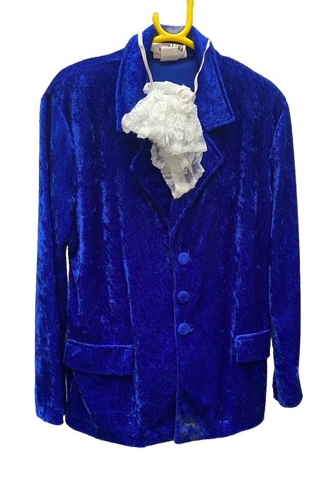 Comprises blue velvet trousers jacket , frilled jabot and a pair of Austin style glasses