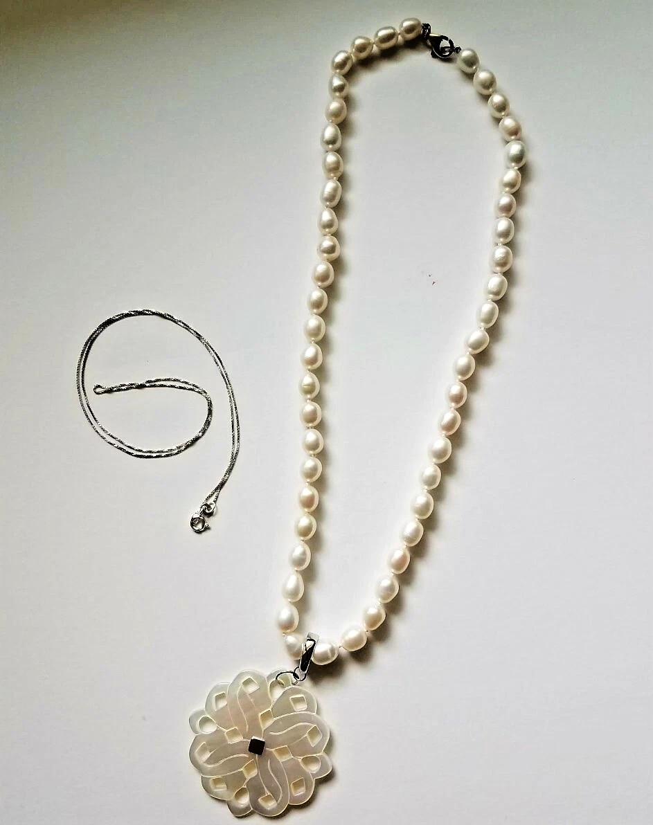 Lenox Mother of Pearl Pierced Flower Pendant Pearl/Silver Necklace 3 PC. 18" New