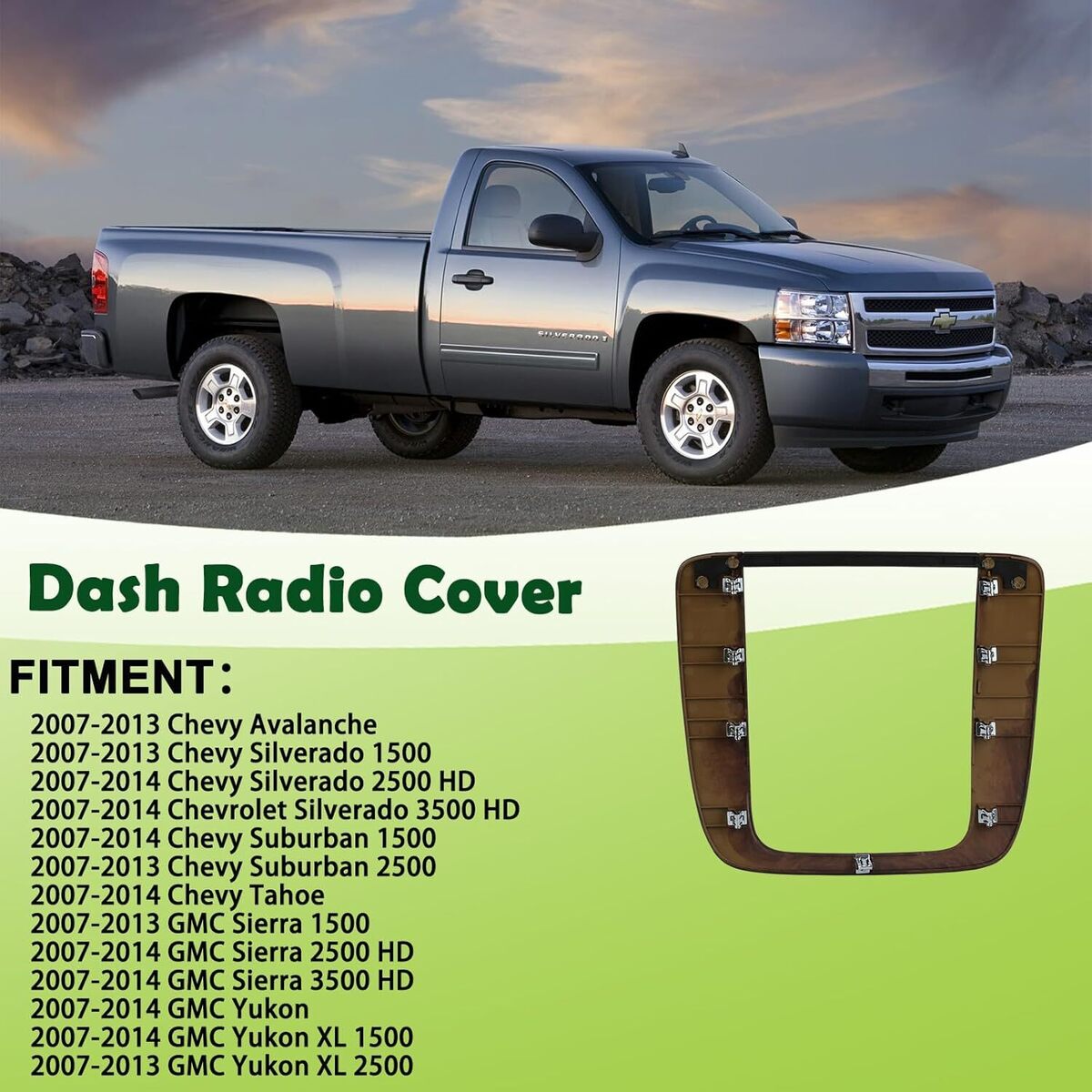 REPLACEMENT PART NUMBER:25887440 This dash radio bezel compatible with Chevy Avalanche/Chevy Silverado 1500/Suburban 2500/GMC Sierra 1500 /Yukon XL 2500 2007 2008 2009 2010 2011 2012 2013,Chevy Silverado 2500 HD 3500 HD/Chevrolet Suburban 1500 /Chevy Tahoe/GMC Yukon/Yukon XL 1500/GMC Sierra 2500 HD 3500 HD 2007 2008 2009 2010 2011 2012 2013 2014 07 08 09 10 11 12 13 14,Please refer to the vehicle compatibility above to ensure proper part This dashboard radio panel is made of good plastic with features such as heat, wear and corrosion resistance. Replacement new parts restore the appearance of your radio plate cover and help provide safer driving experience. This center radio bezel is not the real original parts, but it uses advanced technology and good materials in line with oem standards, more effective extension of service life, directly replace the radio plate , easy to install can save you time and money If you have any questions or concerns about the instrument radio housing,please inform by email and we will provide you with satisfactory service support