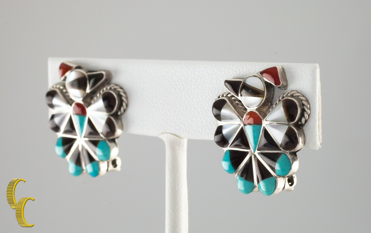 Sterling Silver Lapidary Inlay Eagle Dancer Clip-On Earrings Gorgeous