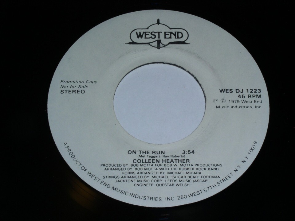 This is a vintage white label promotional 45 rpm phonograph record by Colleen Heather entitled, "On the Run ". Same flipside. Record label: West End WES DJ 1223.