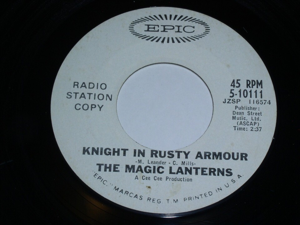 This is the original, vintage white label promotional 45 rpm record by The Magic Lanterns entitled, "Knight In Rusty Armour". Flipside: "Simple Things". Record label Epic 5-10111.