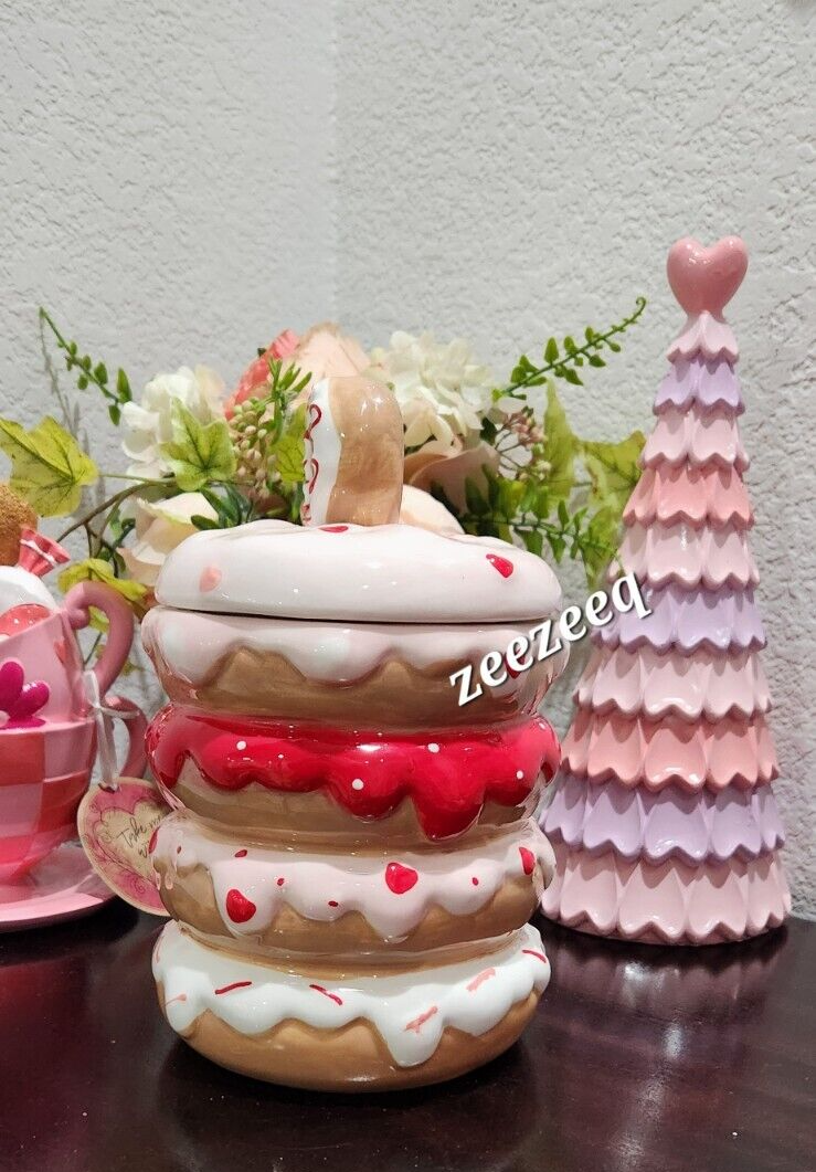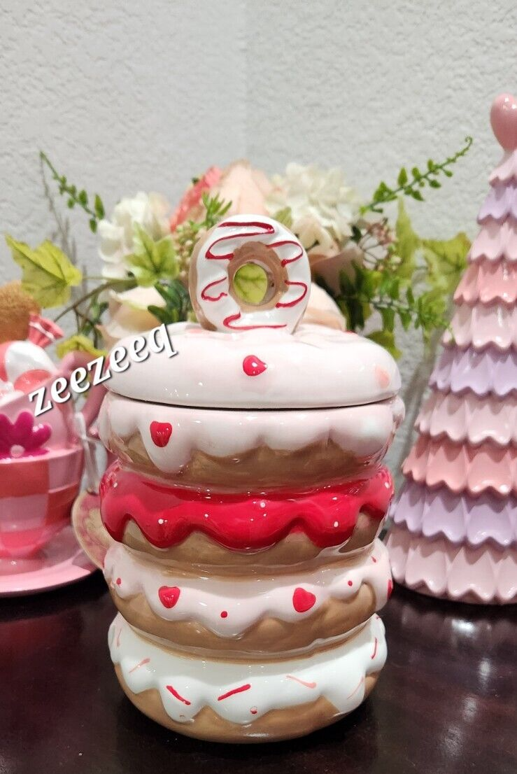Up for sale is this adorable stacked donuts Valentines canister for your Valentines Decor. This piece is adorable!! it has stacked donuts and the donuts have sprikle hearts. Made of ceramic and measures approx 9" tall. New