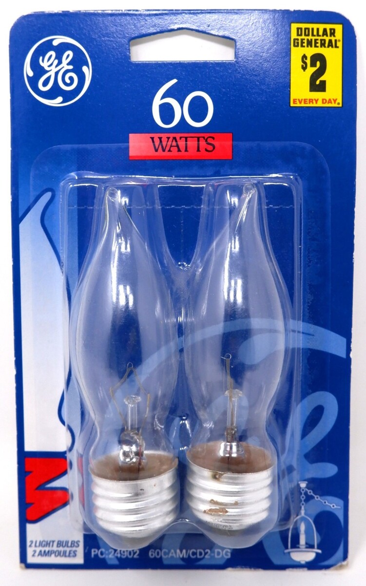 GE GENERAL ELECTRIC 60CAM/CD2-DG MEDIUM BASE 60W 130V CA10 CLEAR BULB 2PK - NEW!