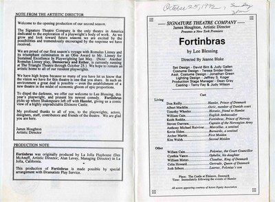 Program from Signature Theatre Co. Presents New York Premier of Fortinbras by Lee Blessing . From 1992. James Houghton, Artistica Director. Extensive cast notes and other information. At the Kampo Cultural Center on Bond Street.