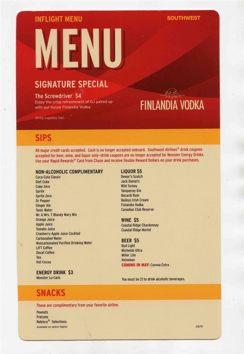 Southwest Airlines Inflight Sips & Snacks Menu