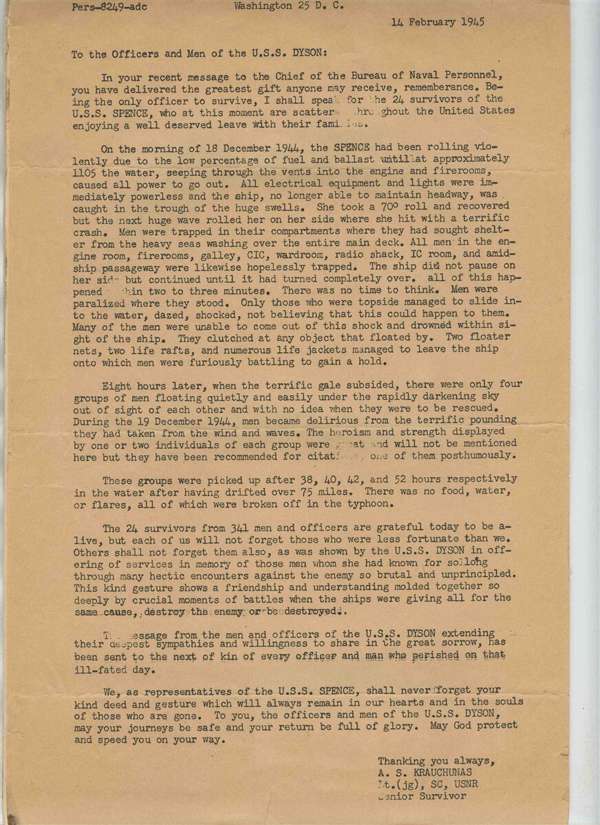 A 3 original individual pages stapled. USS Dyson DD 572 Memo to Chief of Naval Personnel 23 December 1944 on the Sinking USS Spence , a memo to the Crew of the USS Dyson from a Survivor of the USS Spence and a reprint of a Newspaper article from Ornage Texas about the sinking and rescue.