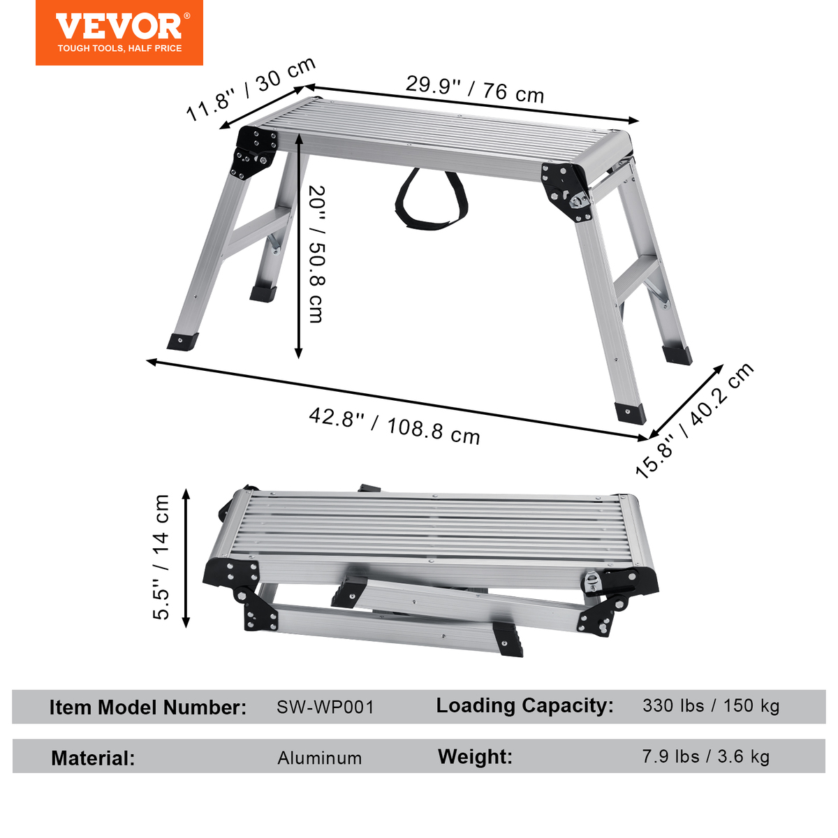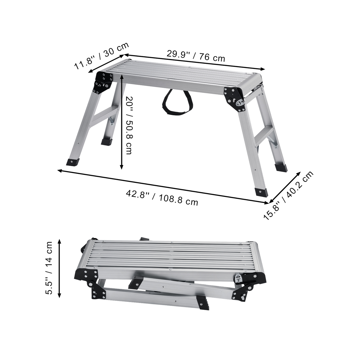 Ultimate Durable Aluminum: Our folding platform is crafted from top-notch aluminum, ensuring resistance to rust and corrosion. Our platforms feature an impressive load capacity of up to 330 lbs, effortlessly bearing the weight of heavy equipment, materials, and tools.