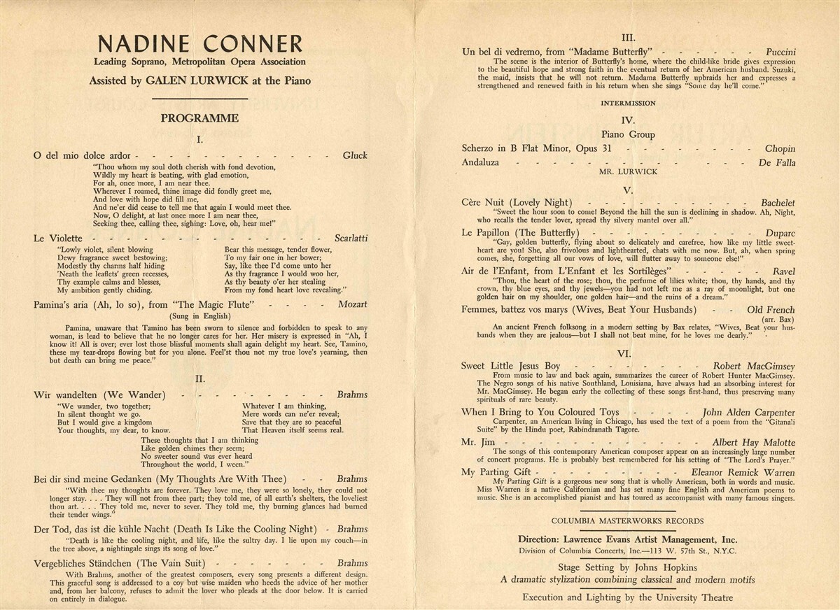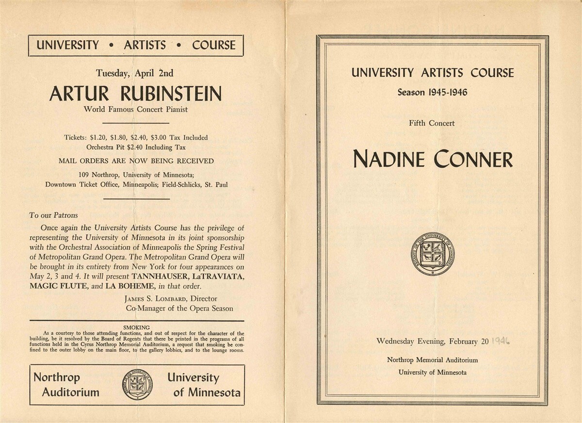 Nadine Conner Concert Program 1946 University of Minnesota Artists Course