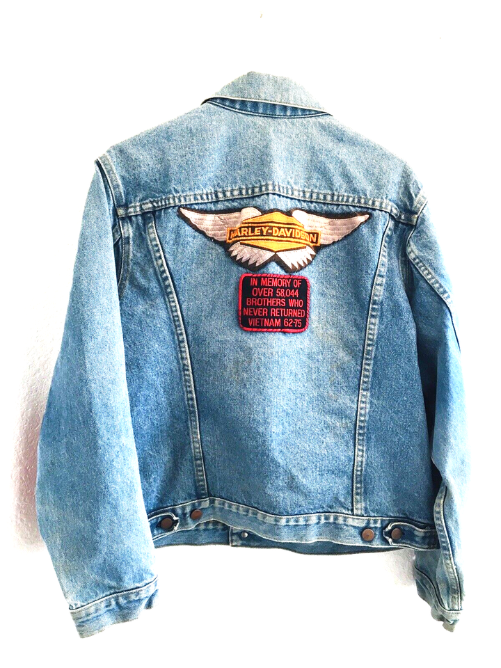 Vtg Steel Denim Trucker Jean Jacket Grunge Sz S 42 USA 70's Memorial Patch 62-75