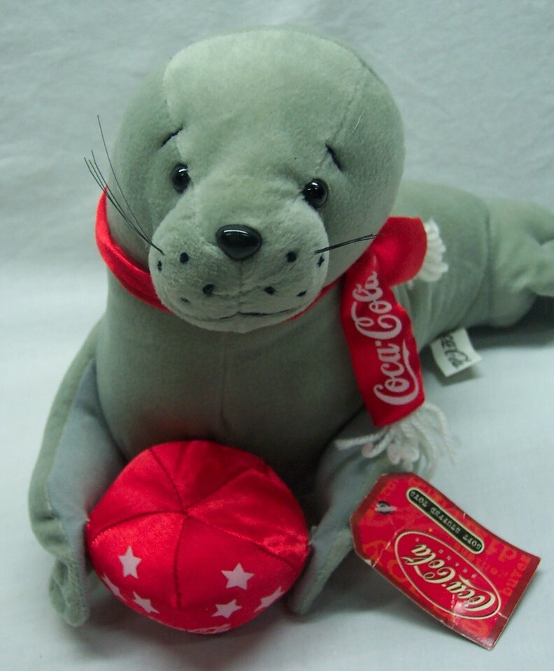 This is a Vintage Coca-Cola COKE GRAY SEAL W/ RED BALL SCARF Plush STUFFED ANIMAL Toy. Made exclusively for Coca-Cola in 2002. It is 8 inches tall and 13 inches long from front to back. It is in great condition with original tag. It is CLEAN! No Stains or tears. The scarf has some fraying. See picture. Combine auctions to save on shipping. Please contact me if you need to make other payment arrangements. EAG o