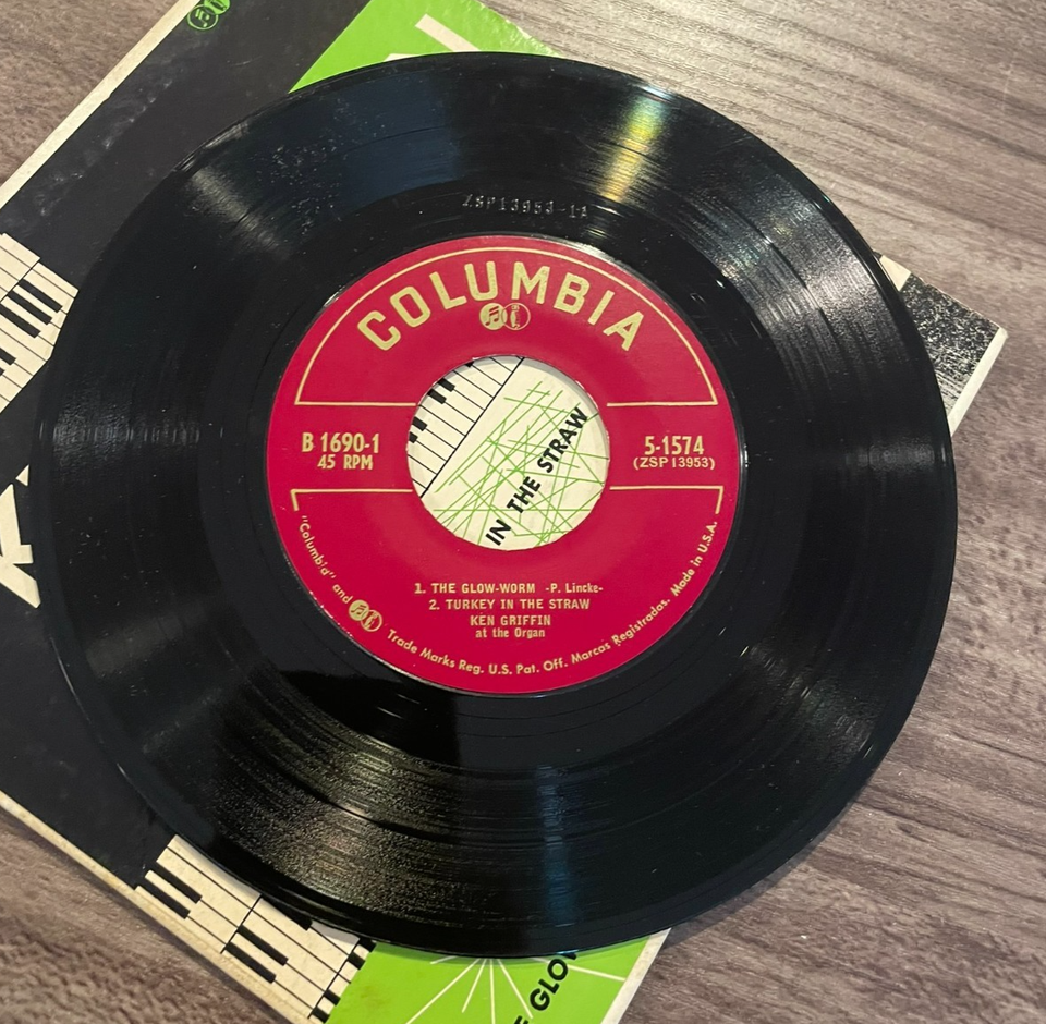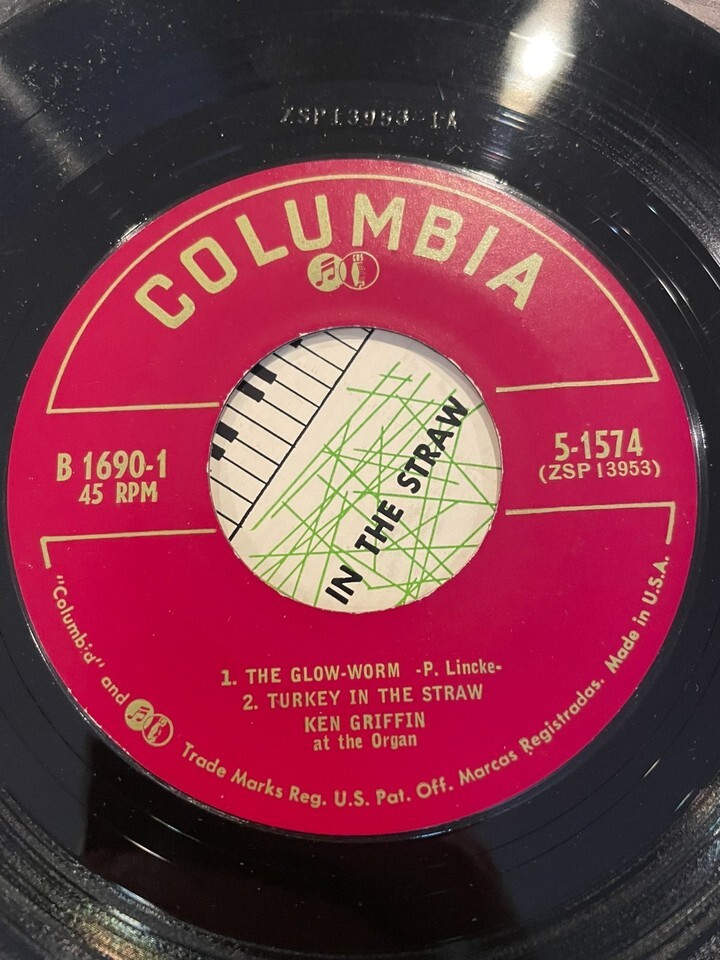 This is a KEN GRIFFIN At the Organ B-1690 The Glow Worm / Turkey In The Straw 45 RECORD. It is in great condition for it's age. Record has no scratches. Cover has a little bit of wear from use. Columbia Records. Made in the USA. EAG