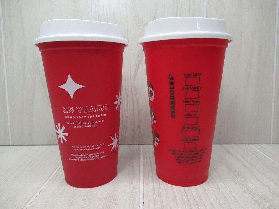 Starbucks red reusable hot cups Christmas 2022 25 Years and Merry Coffee 2019
