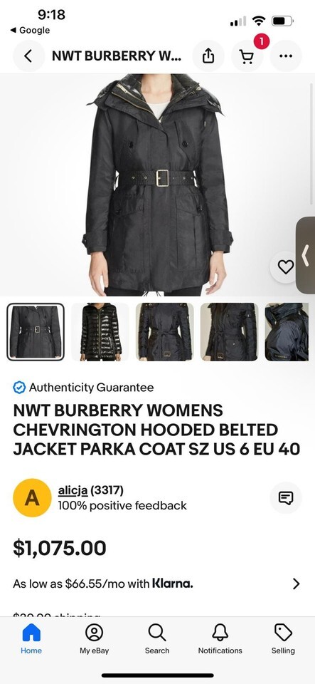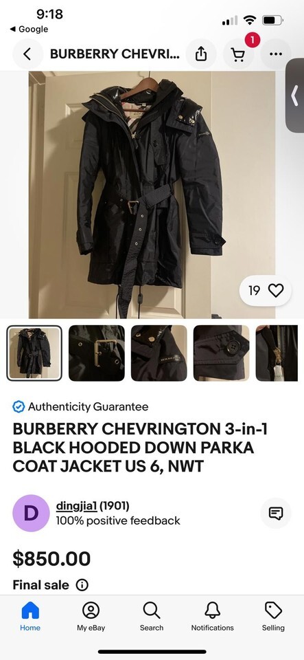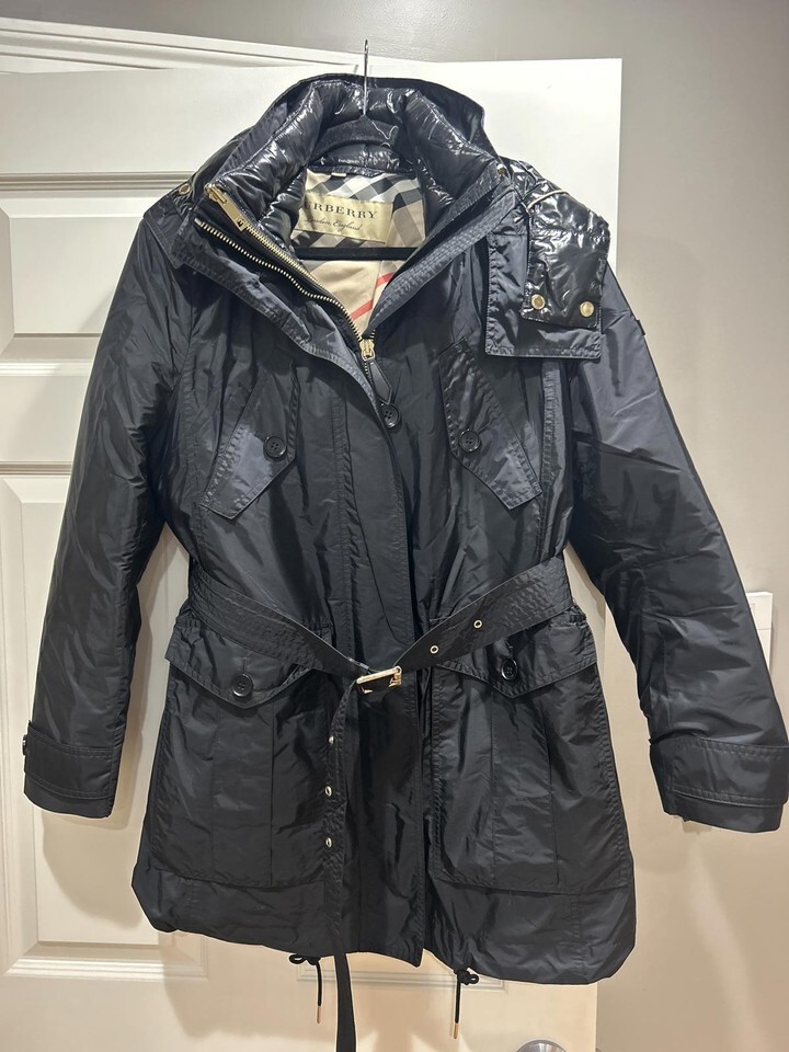 Classic Burberry trench coat/parka in black featuring a belted waist for a tailored fit. Made from durable, water-resistant material with a zip and button closure. Interior showcases signature Burberry check lining. Multiple pockets for convenience. Stylish and practical for various weather conditions.